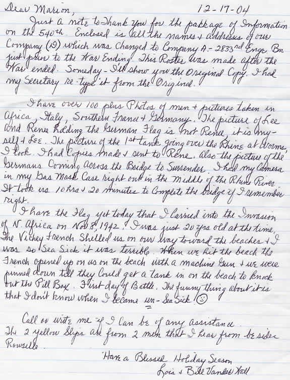 The following are excerpts from Bill’s letter to me. I did not include the actual letter because it contained names and addresses of 540th members and their families.