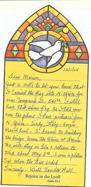 If you’ve gotten this far, then you already know about the American Flag that Bill carried with him when the 540th landed on the North African shores in November of 1942. Below you will see a photo that I took when I spent the weekend with Bill and his wife Lois or “Low-ee” and he affectionately refers to her as. So here’s Bill and the ageless flag, almost 63 years later.