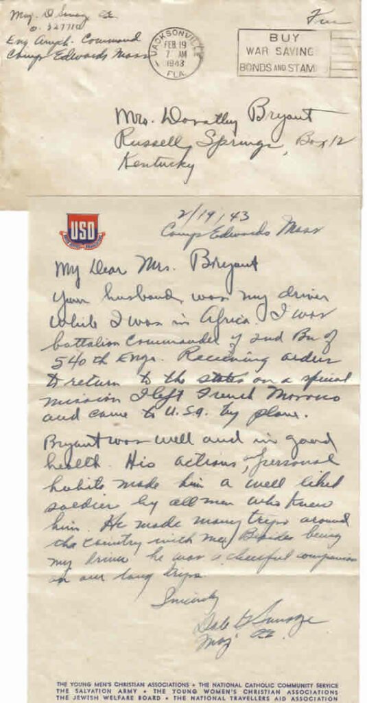 Also, my husband’s uncle, Kisle Monroe from Lawrenceburg, Kentucky was in the Engineers. We have pictures of him also.