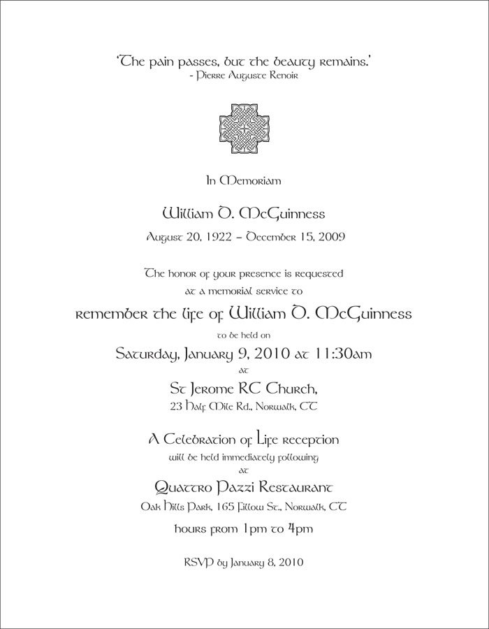 William Danner McGuinness died on December 15, 2009, in Norwalk, CT, surrounded by his children. He was born in Manhattan in 1922, to James P. and Marie Danner McGuinness. His mother died when he was 7, but his father was committed to raising he and his 3 brothers, throughout the Depression and its aftermath. He graduated at the age of 16 from Grover Cleveland High School. Bill commenced his undergraduate studies at Brooklyn College, but interrupted his education to volunteer in the Armed Forces, first as a participant in the Army Specialized Training Program, and upon its termination, the 280th Engineers Combat Battalion. He was part of the reconnaissance team in the Battle of the Bulge (Ardennes), the Battle of the Central Europe and the Battle of Rhineland, which included freeing the 25,000 captives at Essen Slave Labor Camp. Bill returned to the US in April 1946 and graduated from Brooklyn College in 1947. He married Catherine F. Murphy, of Brooklyn, NY on June 21, 1947.