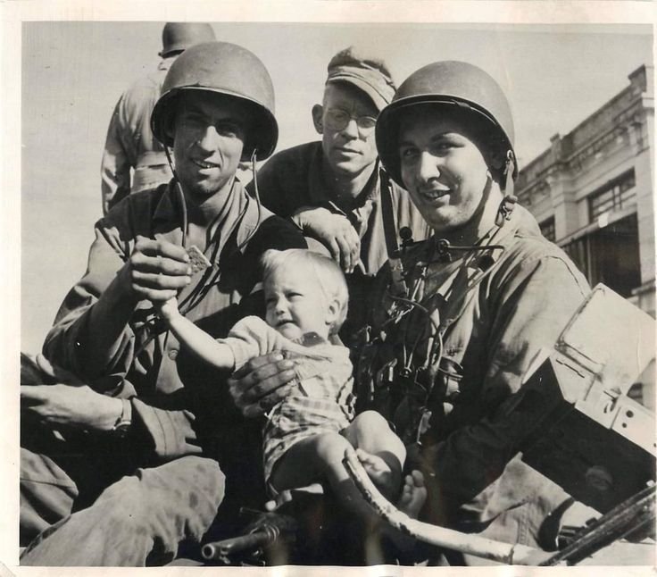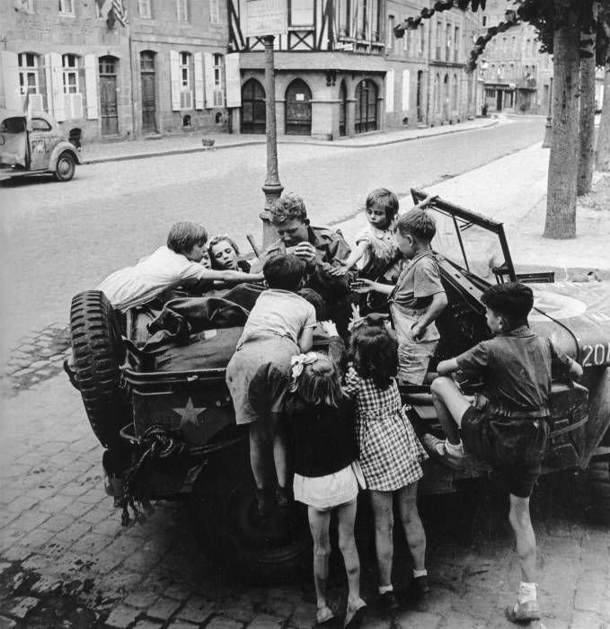 A young French alter server named Louis, still wearing his vestment gown and an American GI’s cap, is served by U.S. soldiers in a chow line. During the war, many young children would be informally “adopted” by military regiments and serve roles to boost morale as a distraction for servicemen with younger siblings or children at home, act as gofers, or become unit mascots. Vierville-sur-Mer, Calvados, Lower Normandy, France. 7 July 1944.