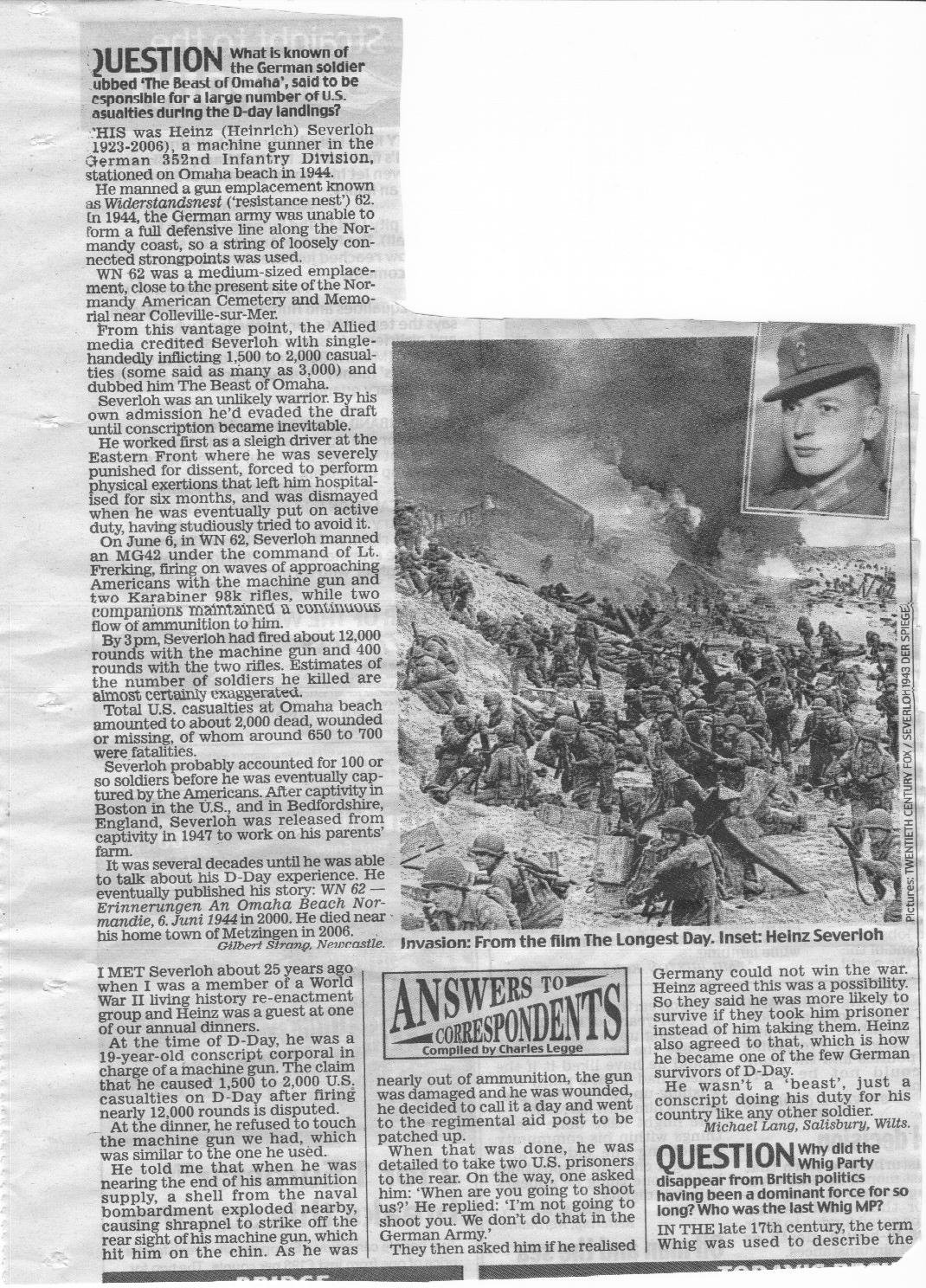 I'd say he had a better right to say "doing my job" then the rest of those jokers who said "only doing my job" as they mass murdered thousands of people. I had never heard that he may have only accounted fro 100 or so casualties before retiring. I had heard the normal large figures, but that would have accounted for a great percentage of all casualties on Omaha if that were true.