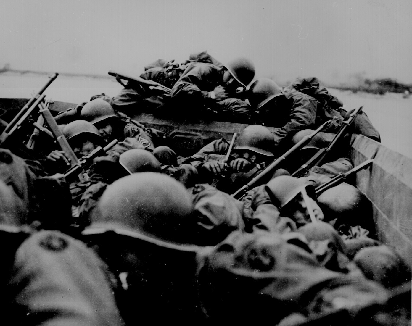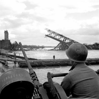 The original caption of this photo: "I drew an assault boat to cross in--just my luck. We all tried to crawl under each other because the lead was flying around like hail." Crossing the Rhine under enemy fire at St. Goar. March 1945.