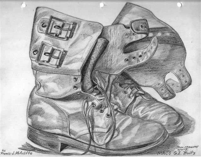 "Mac's" Combat Boots worn through 3 European Campaigns, WW-II. Drawn by brother Frank McAuliffe, for his application to Syracuse Univ. School of Architecture, 1950.