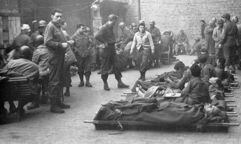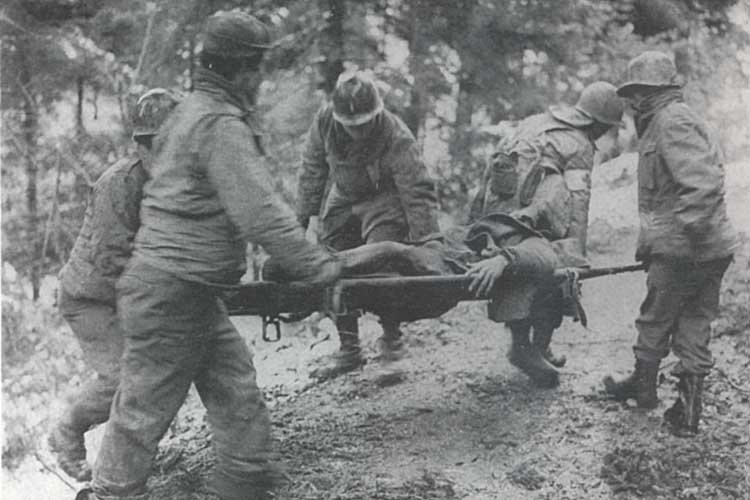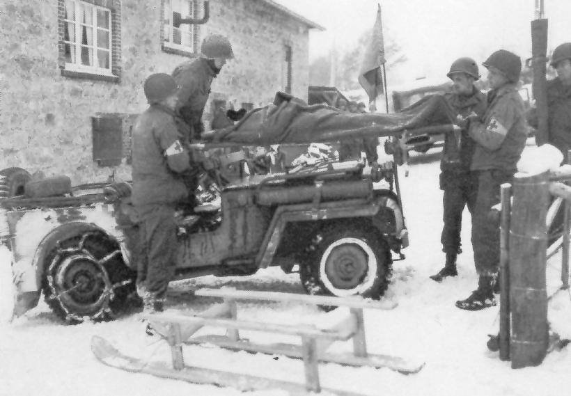 Medical personnel attached to the 119th Infantry Regiment (30th Inf Div) transfer casualties from an Ambulance Jeep to an Aid Station. Note the ski sledge in front of the vehicle, Bulge, Belgium, January 1945.