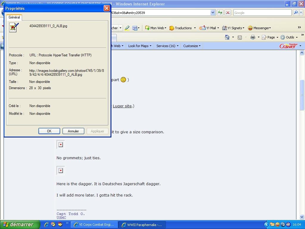 As promised, here are some pictures of the stuff from my parents house. I linked them from my Kodak gallery so I would not take up a lot of server space! The pistol and flag were brought back by my grandfather on my dad's side (who brought me to this site in the first place.) The dagger is from my mom's father. He was also in the army in Europe and eventually retired as a Colonel.