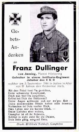 Death Card (front view) of Pvt. Franz Dullinger