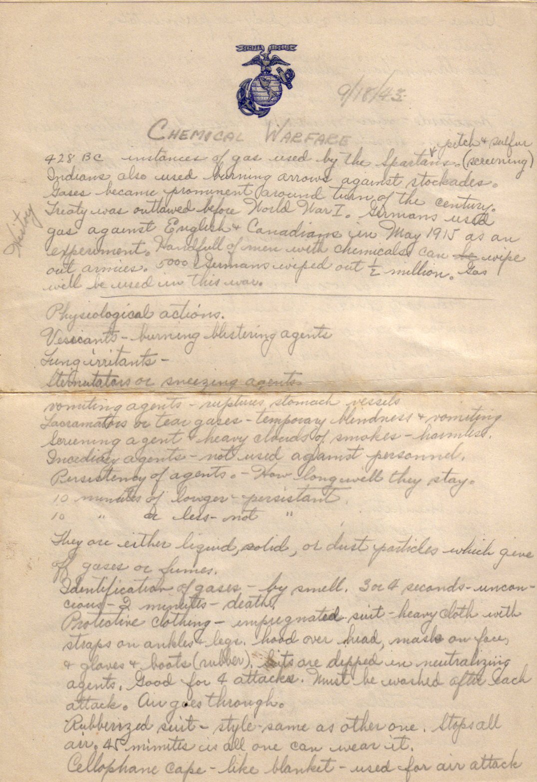 ps- I'm including a scan of some hand written notes about Chemical Warfare that were made by a young Marine in 1943. I found them neatly folded inside his copy of the 1940 "Marine's Handbook." There are written on authentic USMC stationary. I also found the small cut out picture of a Vargas Girl which had been glued into a page 🙂