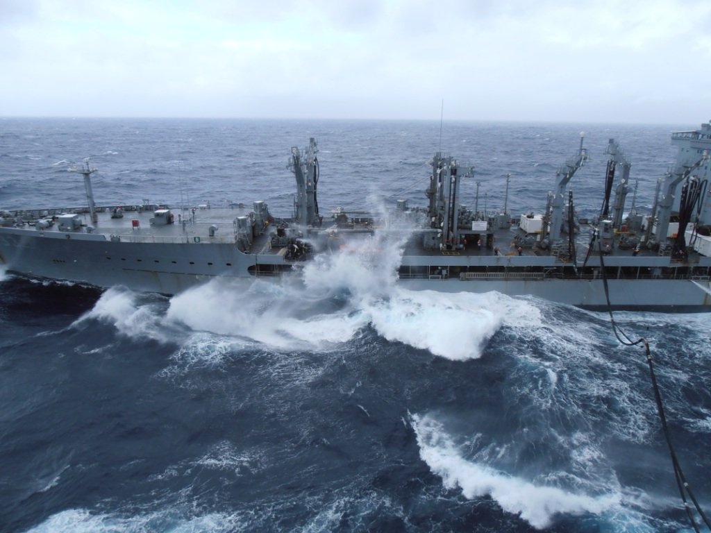 Rough seas hitting a resupply ship during a RAS (replenishment at sea)