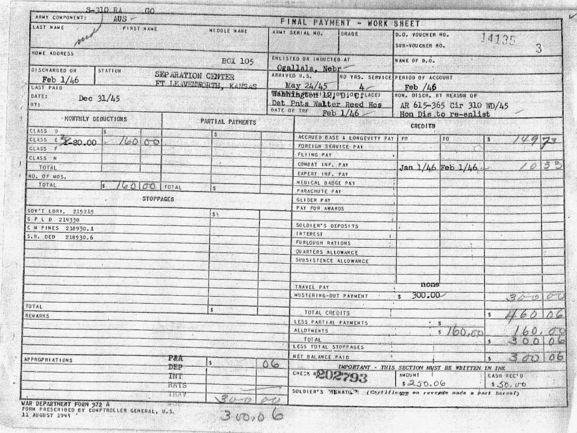 As i recall i was married so I think 21 dollars was sent home for wife and child and 10 dollars was deducted for life insurance that left a private with 29 dollars a month, with no place to spend it. We used to send most home till after the war ended then there were places to spend money snopp shops white lighting. My child was born when I was in France, Aug 1944 She was 16 months old before i saw her. That's history from years ago.