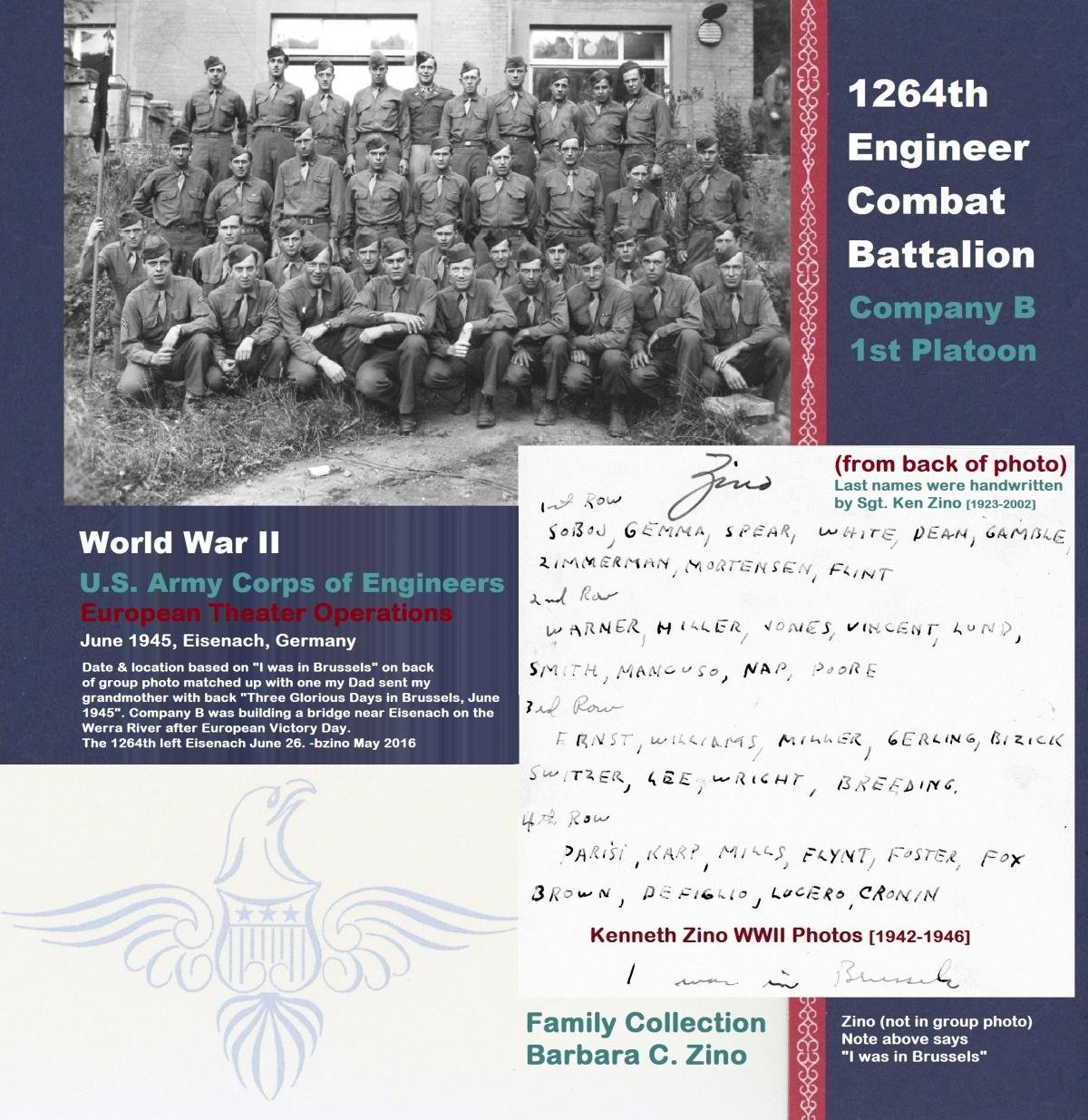I have an official letter dated 22 January 1946 from Commanding officer, Captain Arthur N Hibbs. It certifies that Sgt Kenneth Zino was an enlisted man who served in the "Army of Occupation" with the American Force in Germany for the period 9 May 1945 to 24 January 1946 inclusive. (The 1264th ECB History book has a farewell letter from Arthur H Lahlum, Lt Col dated 26 August 1945).