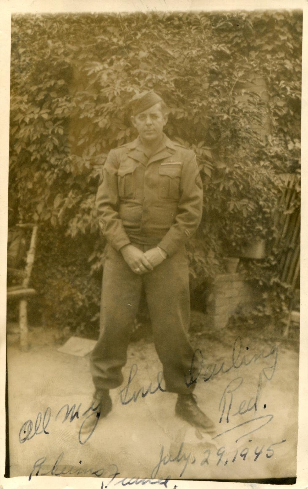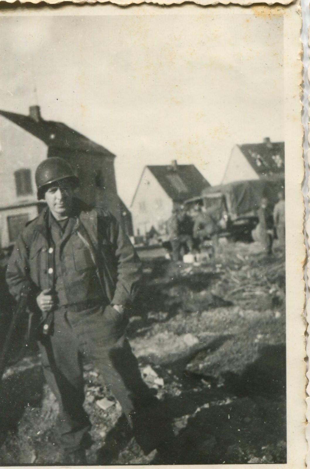 What Dad and two other engineers had to do that night was to get the infantry what they needed to make it through the night. It was getting dark when they started. They commandeered a jeep and drove around, with no lights, rounding up the ammo, rations and supplies. They drove the jeep to the river bank and got it onto a damaged bridge section. Crossing was slow going and the men hoped that the Germans wouldn't target the jeep. The machine guns were not firing at night to keep from giving their positions away but if they valued the target enough, anything was possible. When they reached the far bank they unloaded the jeep and carried everything up the bank with a little help from the infantry. Back on the west side of the river they drove the jeep off of the makeshift raft and went several miles back to where B Company was bedded down. It was early morning and the company was sleeping in an open field. Nobody was sleeping very soundly and when the three men came in they were recognized and someone said, " We thought you guys had been killed ".