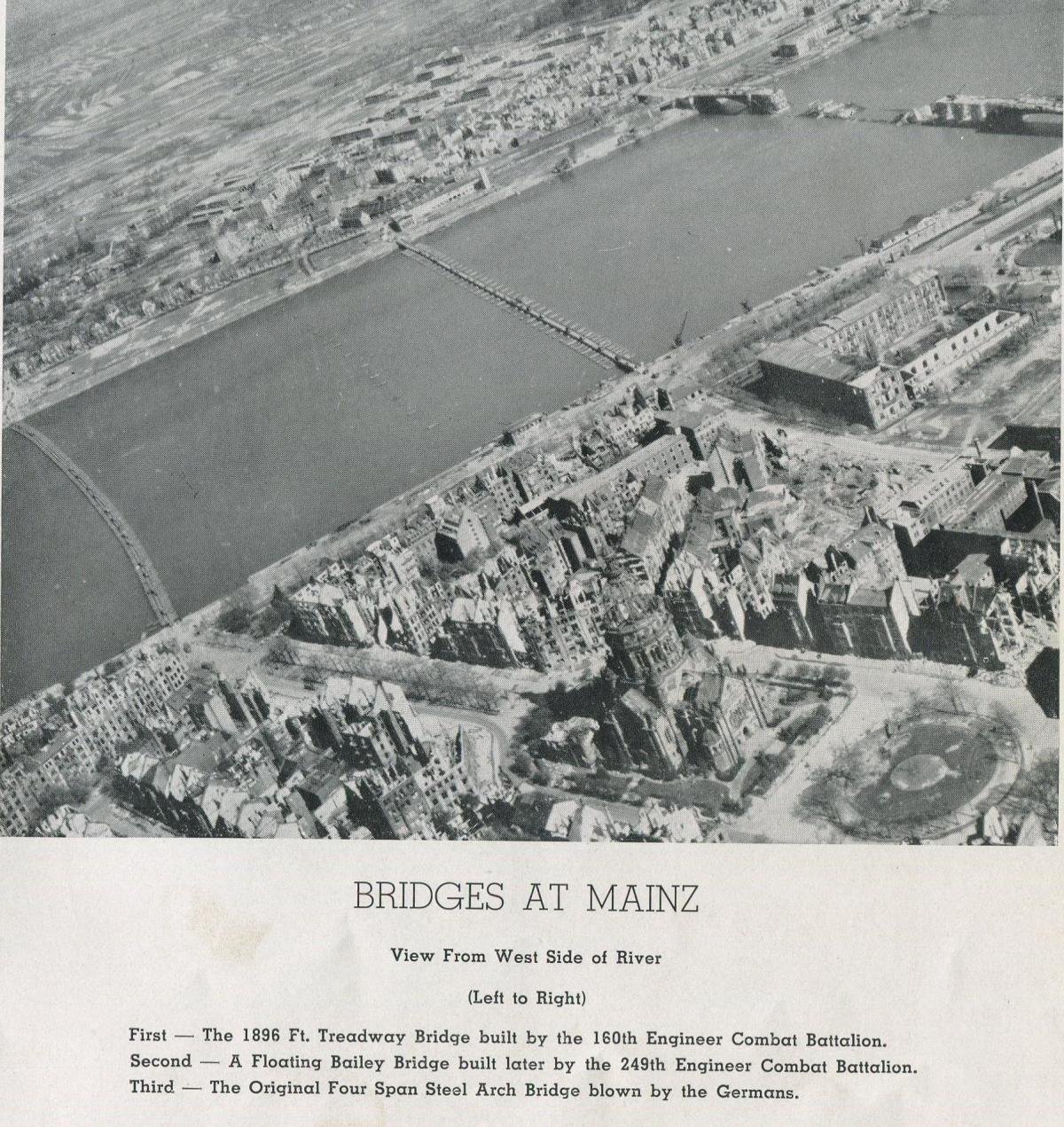 The 160 Engineer Combat Battalion built a lot of bridges in Europe but the one that Dad talked about most was the longest tactical bridge in the world, built across the Rhine River at Mainz, Germany. It was 1,896 feet long, used 154 pontons and was built under enemy fire. Dad remembers that there were many tent camps just west of Mainz. Camped there were engineers building the bridge, the U.S. Navy operating boats getting men and supplies across and the others were waiting for a bridge to get across the Rhine. These are a few pictures from those days.