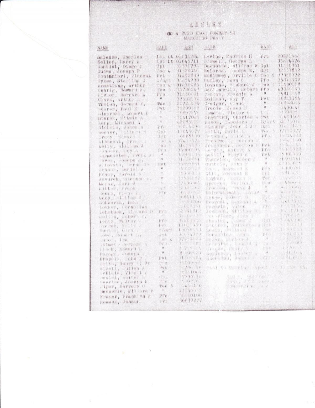 Warmest welcome to the forum! It is always exciting to me to meet another family member of a 292nd soldier. My grandfather, PFC Arthur A. Clark, was in company A of the 292nd. I have been doing some research on this unit for the last few years and have a lot that I can share with you. I have obtained from the NARA the unit histories, after action reports, and journals of the 292nd. I have copied a number of the morning reports of company A from the NPRC in St. Louis. According to one of the morning report documents I have your father-in-law, S/SGT Sterling C Sykes ASN# 34454730, was also a member of company A. I have attached a copy of this document below, sorry it is not that easy to see but you can understand because of the age. Your father-in-law's name is listed in the first column, 6th name down. You will notice my grandfather's name is listed just four names down from your father-in-law. As Marion has stated there is no problem posting your photos, and I as well as others are really looking forward to seeing them. I have photos to share as well. Hope to hear from you soon,