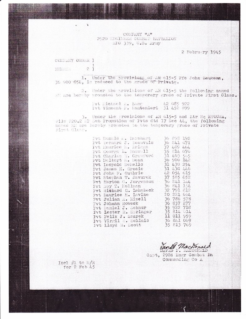 I have been interested in WWII history for many years and started researching my grandfather's unit in earnest the last several years. I have aquired from the National Archives the Unit Journals, After Action Reports,and History of the 292nd, a total of some 250 pages of documents. I of course will be glad to share all information that I have about the 292nd, and look forward to whatever others have to share in return, Last year I made a trip to the NPRC in St. Louis to look and copy some Morning Reports of Co. A. One of the documents I have I believe SamHarrison is really going to like. It is a company order dated 2 FEB 1945 and contains a list of soldiers names to be promoted to the rank of Private First Class. SamHarrison's great uncles name, Julian A. Mizell, appears on this list. I have attached a copy of the document below.
