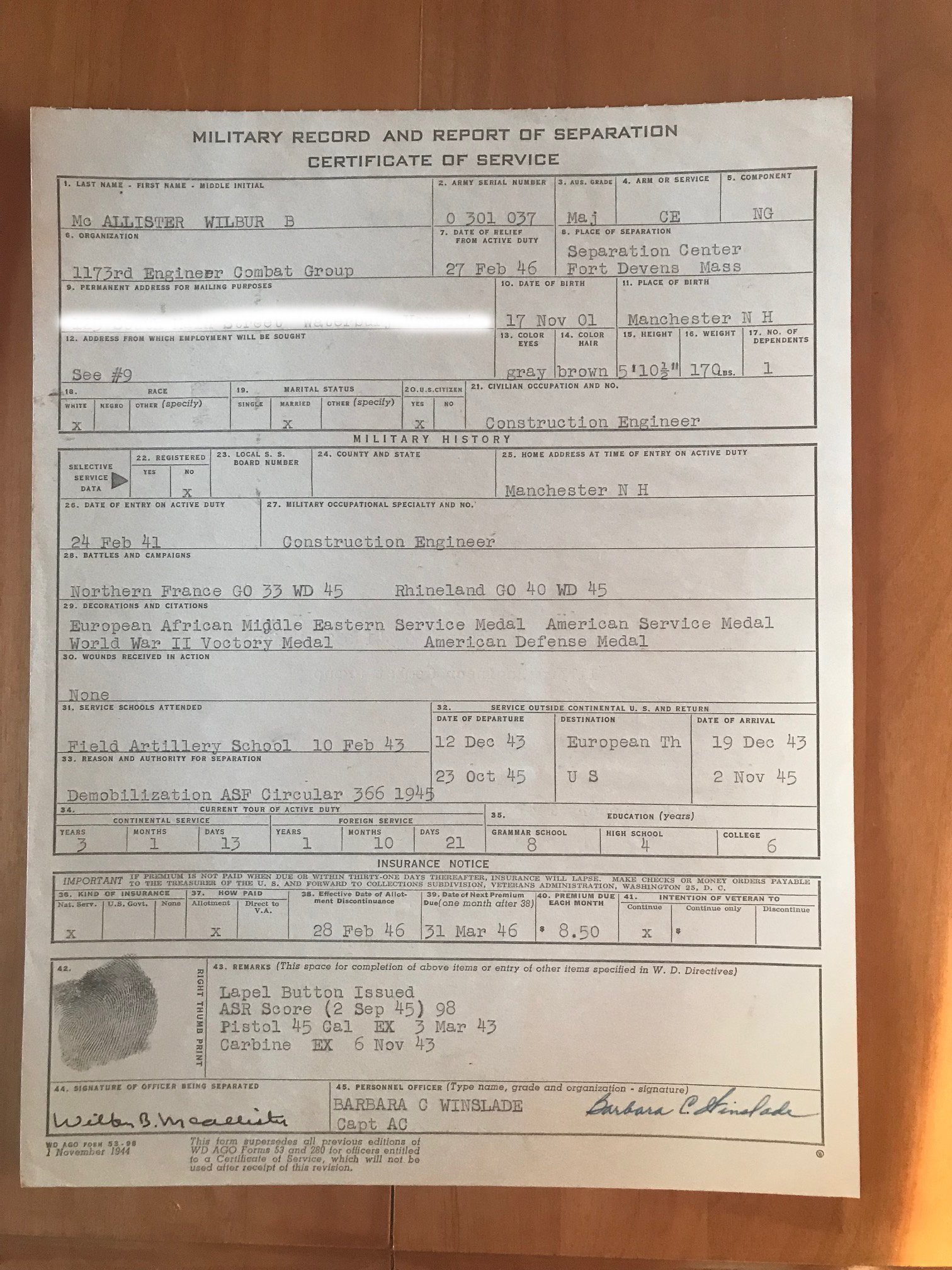 3. According to the discharge and to the Campaign & Citation Register?, he earned credit for Northern France and the Rhineland Campaigns. The Discharge also notes he entered service via the National Guard. So, he served in more than one unit before getting to the 1173rd. I suggest you contact the State (where he was living at the time) National Guard HQ and see what they can tell you, if anything.
