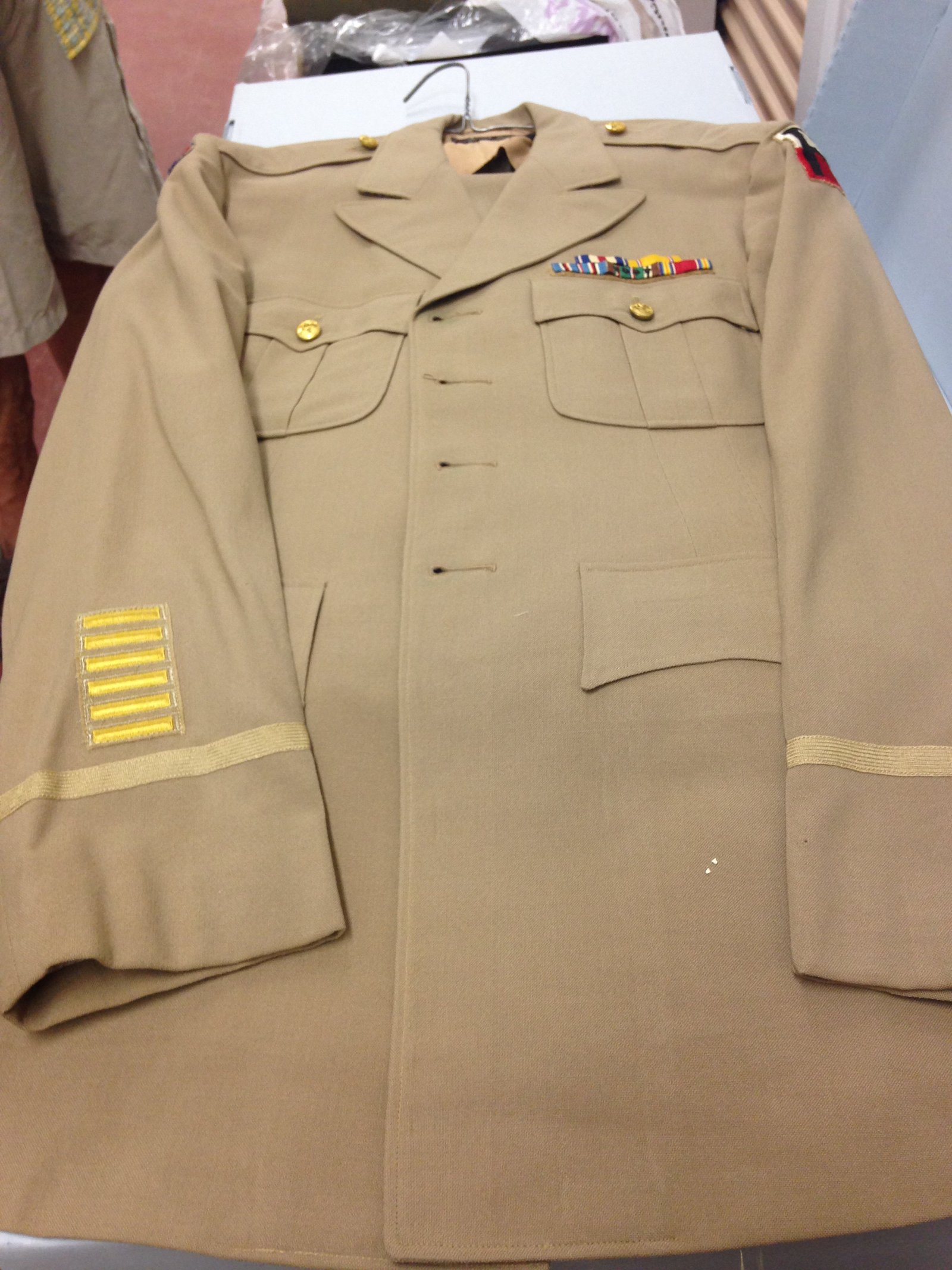 - One tan dress uniform. Displays First Army Patch on one shoulder and 3rd Army Patch on the other. Hash marks and ribbon rack representing all medals listed previously. I had been told this uniform is what he wore while heavily involved in retired officer activity.