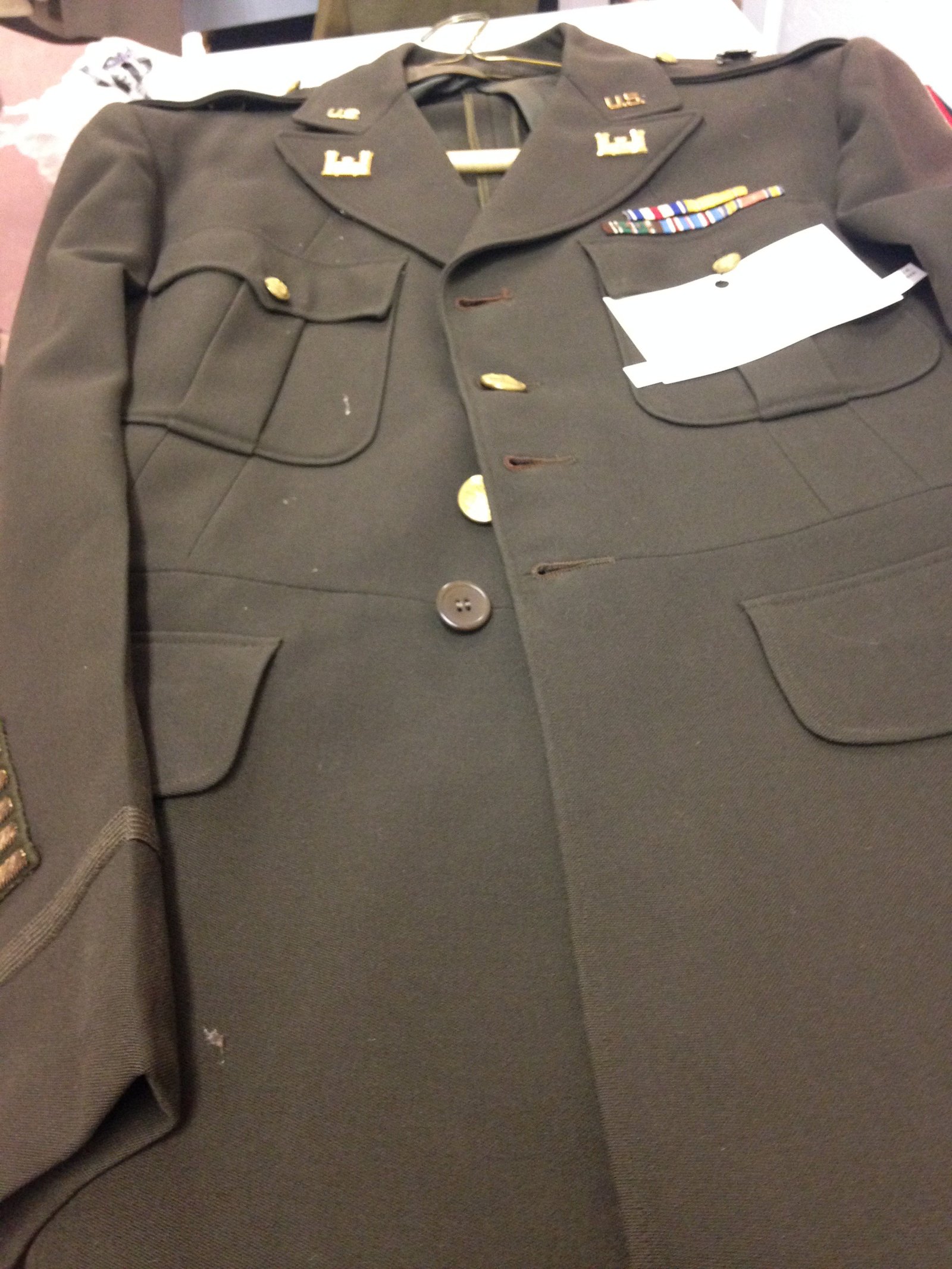 - One early jacket (field jacket?) displays a First Army patch and a VIII (8 Corp) patch. Hash marks are present on sleeve. No other pins, patches, etc.