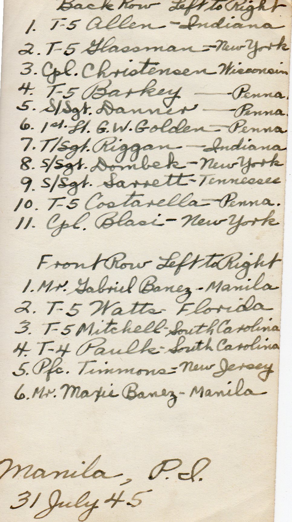 I am looking for any information on this group of Engineers. Photo taken 31 JU: 1945 - I have the list of names on the back and will post in this or a next frame depending on my PC Skills. To the best of my knowledge they were deployed from Fort Polk, LA to the west coast in FEB 1945 and to the Pacific about that same time and were mostly operating out of Manila until the end of the war. My Dad is back row 5th in (With his left arm on the bench)