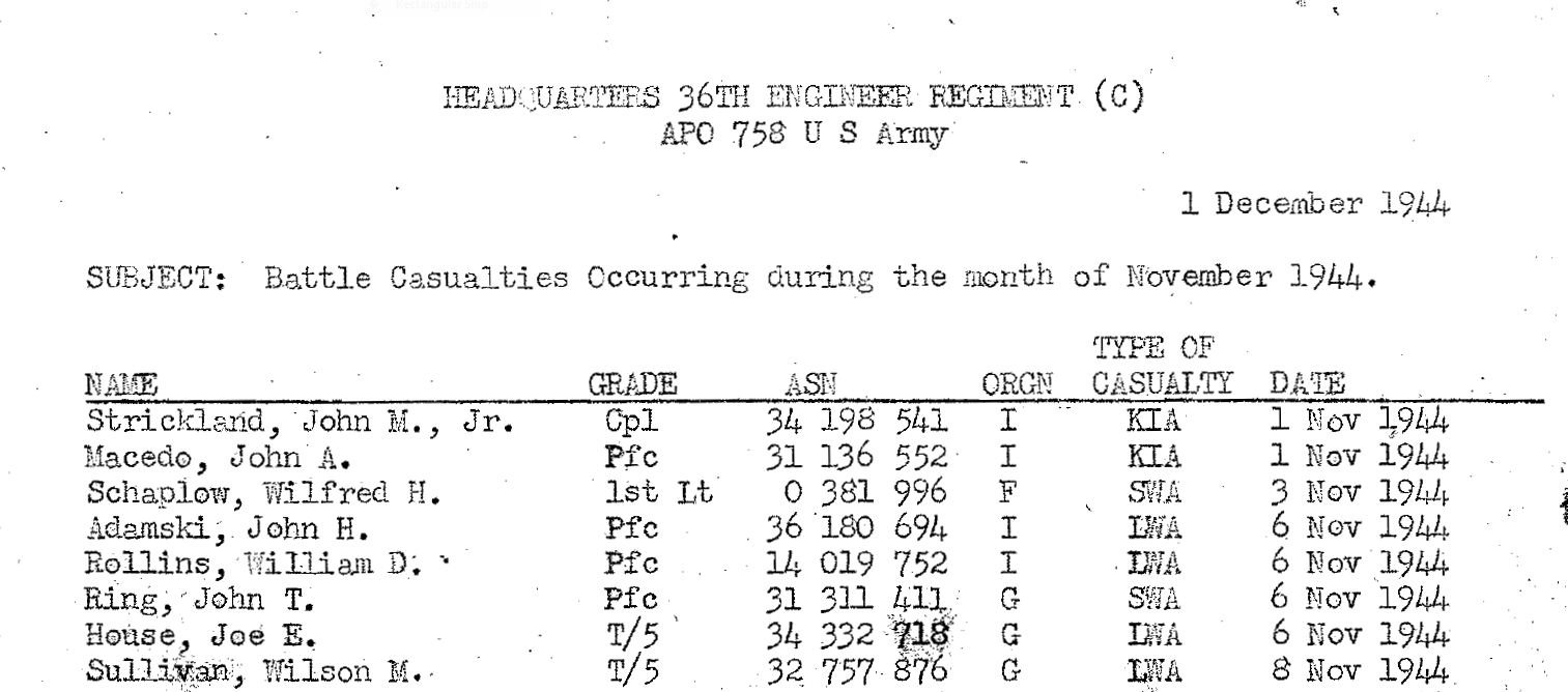 I am including here, a few more things, including an attached page from the Sitreps from November 1944, which shows John's name as KIA.