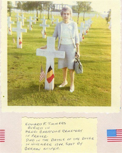 My grandfather is buried very near Edward Timmers. Name William Walcher Plot: G Row: 14 Grave: 2. I do not know your schedule or your visitation schedule, however if you do again visit, would you mind honoring this grave in my place as well? Perhaps a picture if you do visit?
