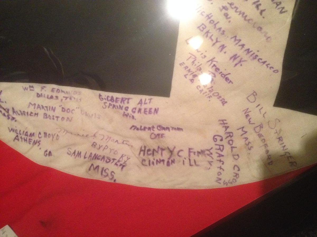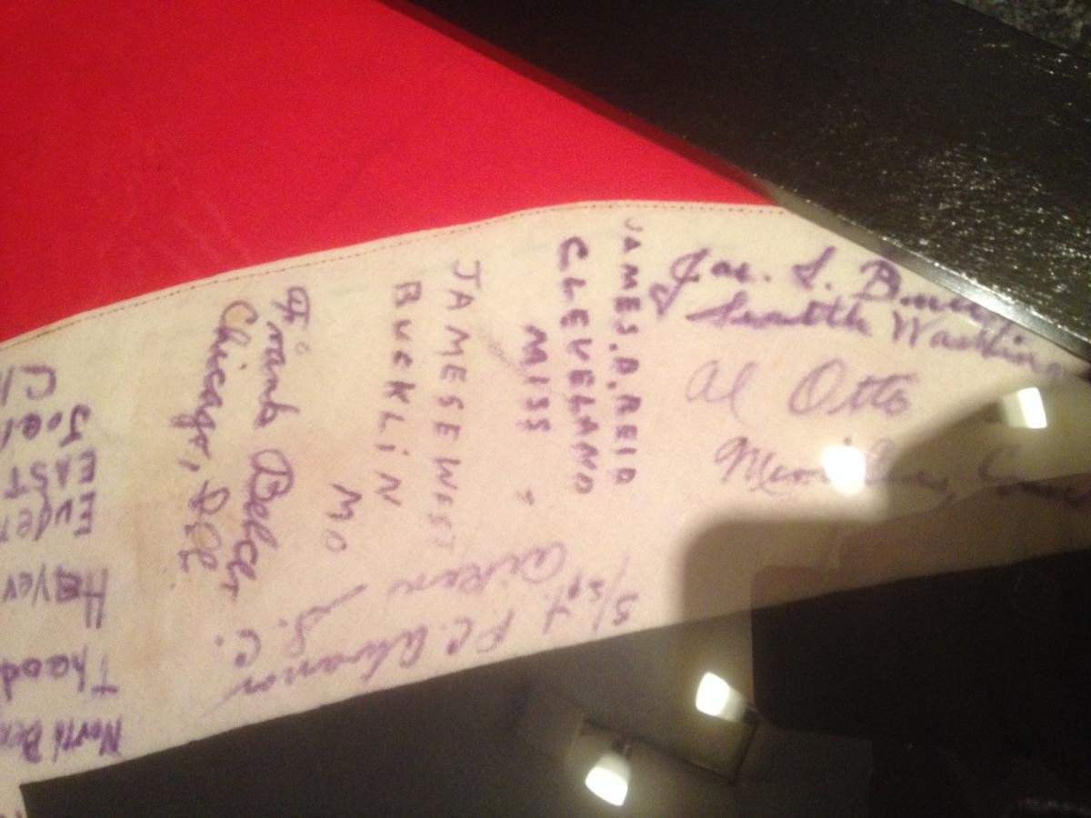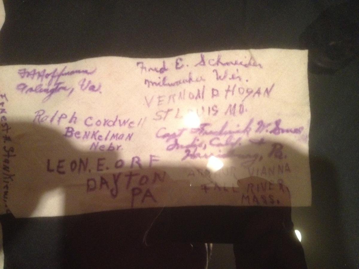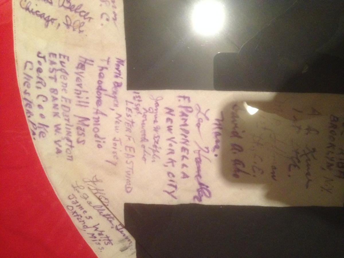 Dear Leroy Hezemans, My father was a member of the 133rd. His signature appears in your photograph: David A. Aho. It was quite emotional to see it there. You may be interested to know that I am currently working on a research project ( I am an artist) about the 133rd and various events they were involved with in WW2. I can fill you in on everything you would like to know when we have made contact. I may even be able to pinpoint the location of the battalion on the date you have for the capture of the flag as I now have copies of all the operational reports. Please, when you have a chance, tell me where you are located and anything additional you might know about the flag and how it was obtained by the 133rd. I will eagerly look forward to hearing from you. Sincerely, Eric Aho, Saxtons River, Vermont, USA by Facebook or (Marion's note, removed your email for privacy sake - please use personal messaging)