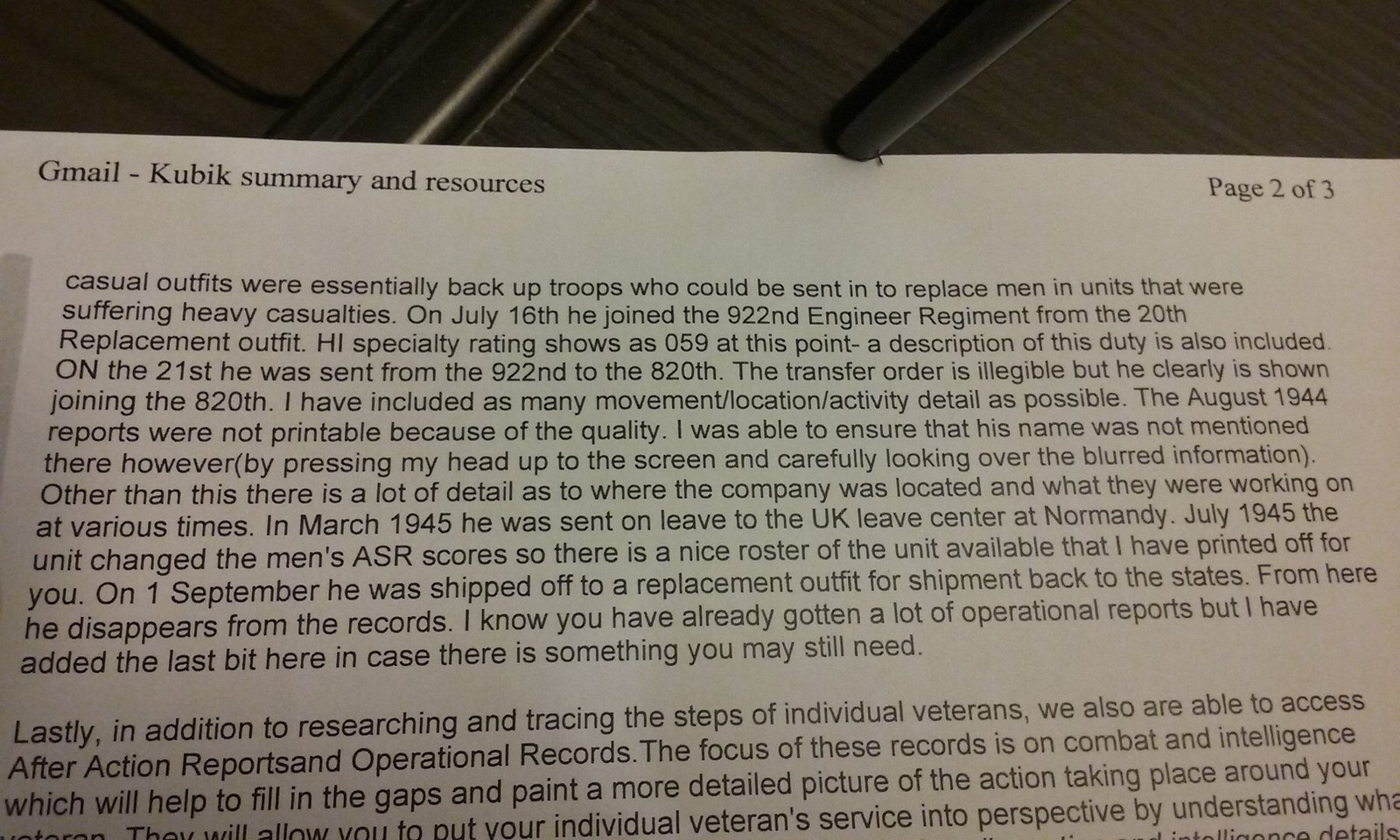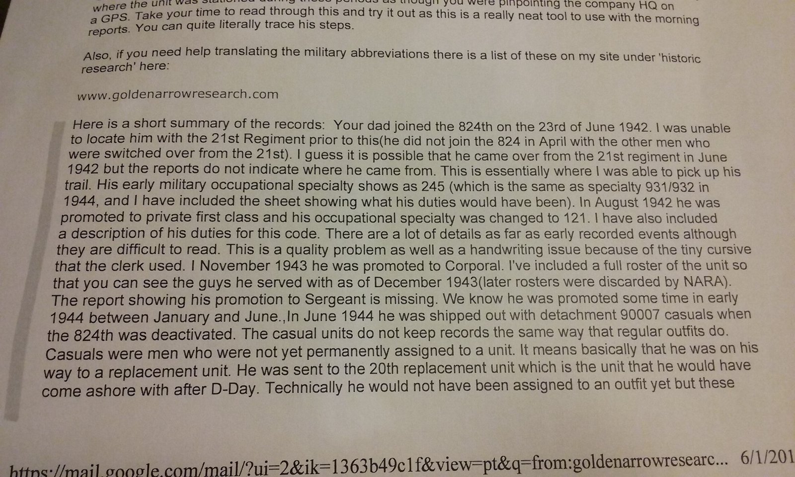 This is the file the researcher sent me on my Dad in B Co. 824th EAB and C Co. 820th EAB.