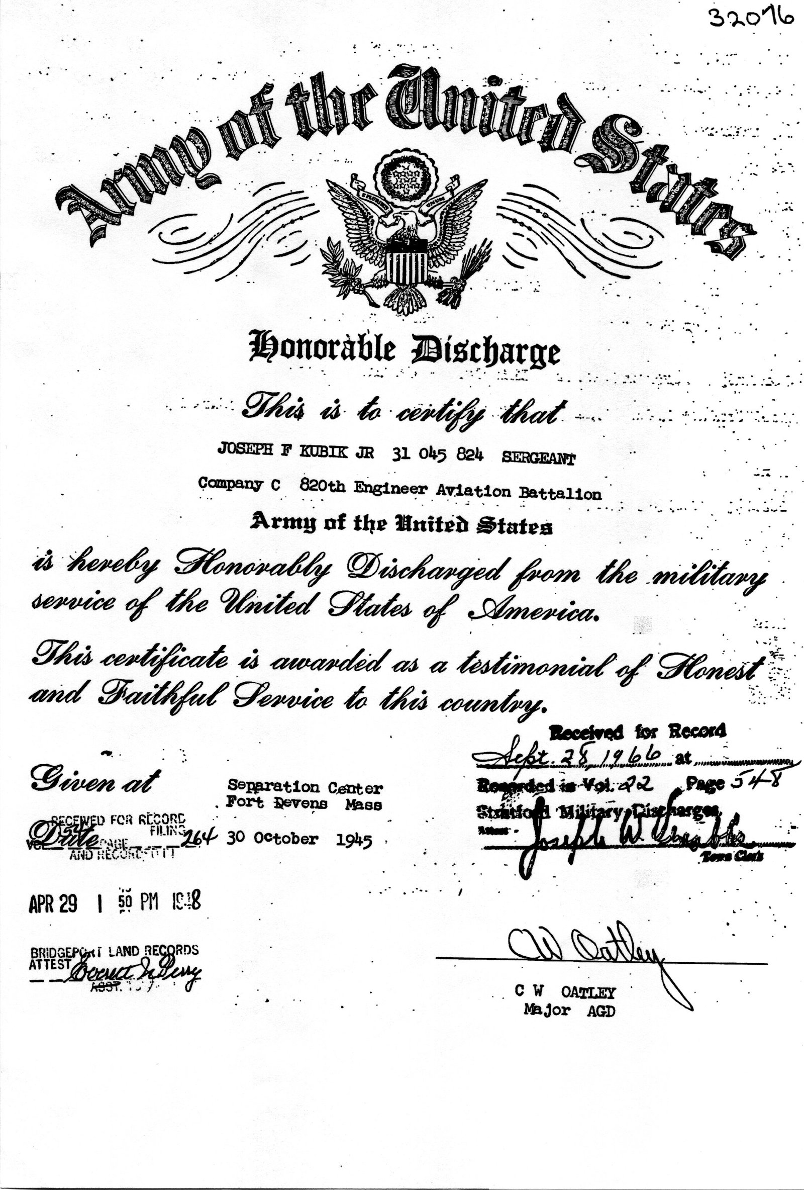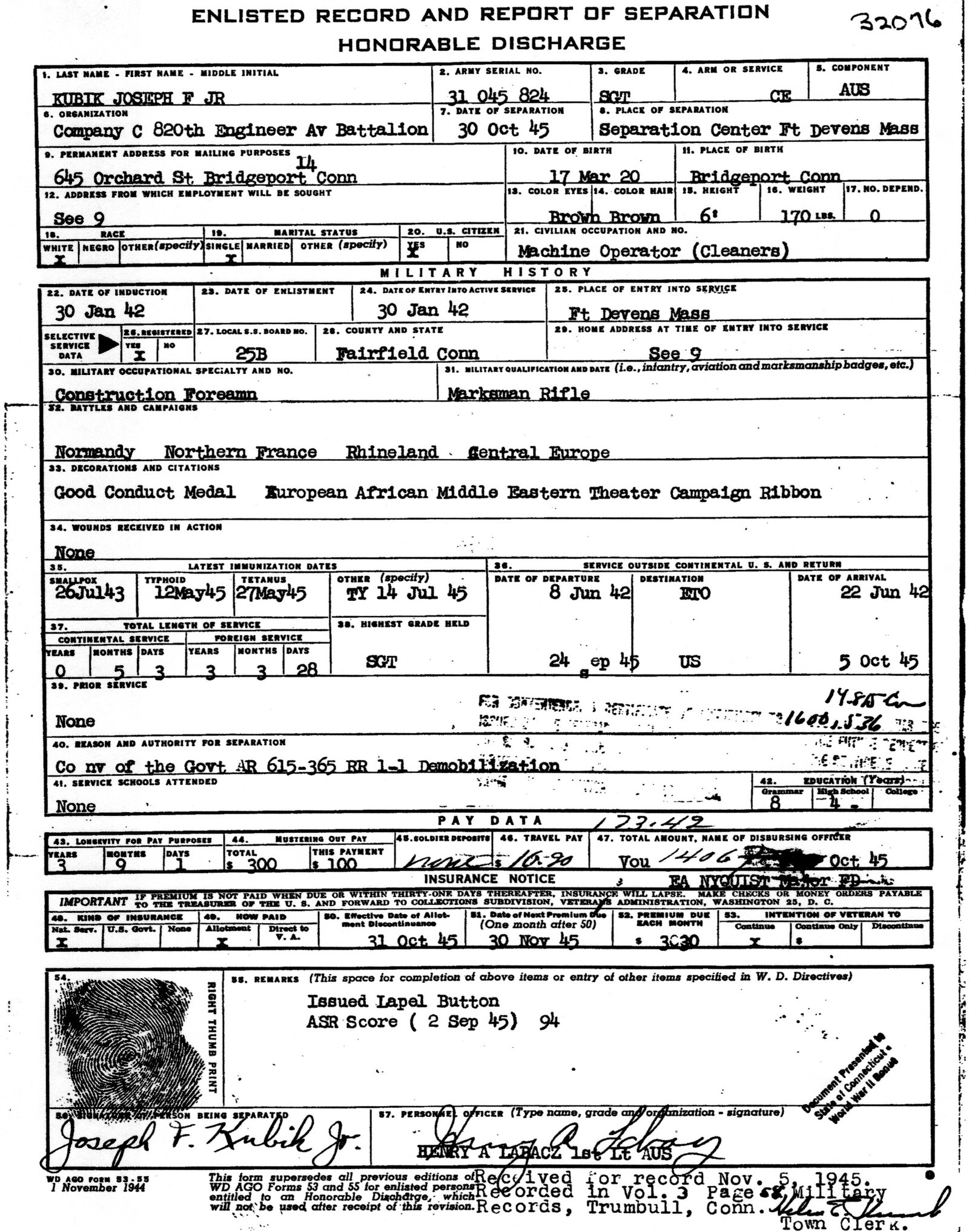 Shows the 824th, which, like what Slinky 75 related, his Honorable Discharge shows something else ( since learned a Discharge shows the LAST unit someone was assigned to, not ALL ). My Dad's DD214 shows the 820th EAB, which is where he was placed for D-Day.