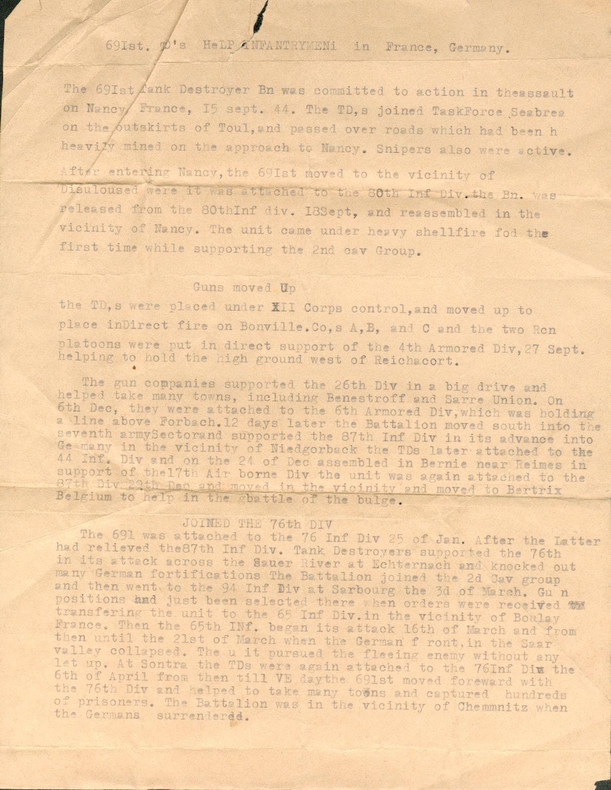 I apologize for the poor quality image, but I am not in possession of the actual document..just a scan. For those who are interested it makes a big difference if you can enlarge it as Marion suggested. Sounds like Uncle Rusty and the 691rst spent most of their time at the tip of the spear along with all the infantry units that are mentioned. Today my cousin Dan sent me the name of the place where Sgt. Wells saved the other man's life during an artillery & mortar barrage. It's called "Rechicourt La Petite France" (that's for you, Vee