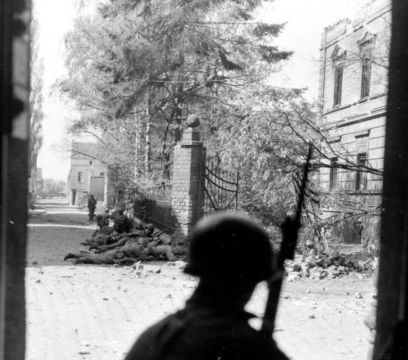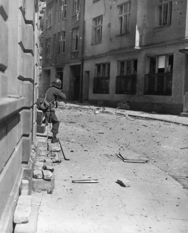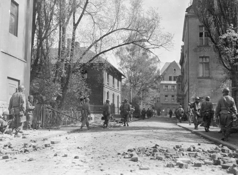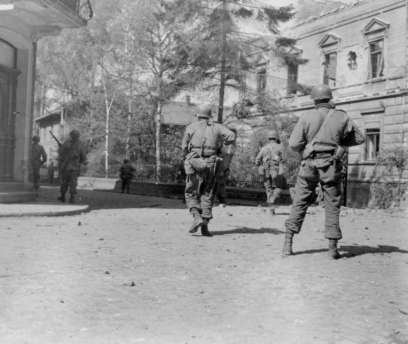 1 - A squad of infantry from the 97th stalking German snipers and machine gun positions in Siegburg, April 10, 1945
