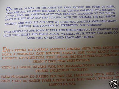 This little booklet was created in 1945 by the people of PLZEN, CZECHOSLOVAKIA as a Thank You gift to the American Army soldiers who disarmed the last garrison of Nazi troops and liberated the city on May 6,1945. I wish I could show you all the pictures too, but the message they wrote sums it up best. The citizens of this town were not yet aware that their freedom was short lived, as their country was soon swallowed up by Stalin and would spend nearly the next 45 years under communist rule.