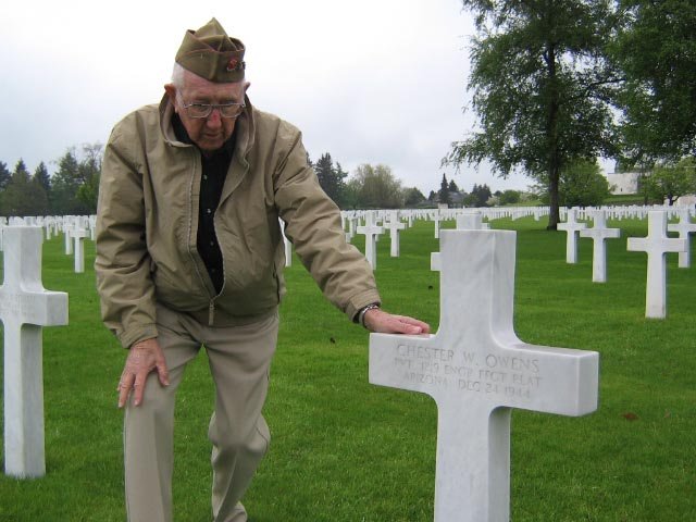 "Private Chester Owens, an Engineer soldier/fire fighter and member of the 1219th US Army Engineer Fire Fighting Platoon on December 24, Christmas Eve, 1944 on his way to a fire in Malmedy, Belgium was killed by what is believed to be enemy action. He rests with 7991 other US military in the beautiful US Military Cemetery at Henri-Chapelle, Belgium. I was a member of the 1204th US Army Engineer Fire Fighting Platoon. It was a privilege and an honor to be able to visit my Brother to pay my respects and offer my salute."