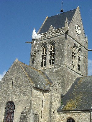 I recently visited Normandy with friends and family and thought these pictures of the church in St Mere Eglise may be of interest.