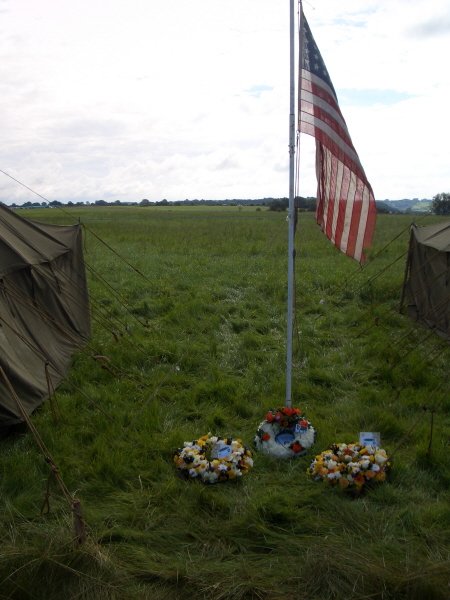 DUSK ON THE AIRFIELD... 'OLD GLORY' HANGS AT HALF MAST ABOVE THE THREE WREATHS THAT THE GROUP WILL LAY IN THE VILLAGE