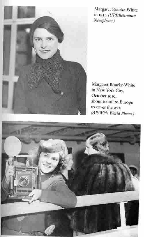 * Margaret Bourke-White, hired in 1935 as the first female photojournalist for Life magazine, was also the first female American war correspondent and the first allowed to work in combat zones during World War II. Bourke-White covered the London Blitz, the Russian war effort, and various World War II battles. She also was one of the first photographers to enter and document the Nazi death camps.