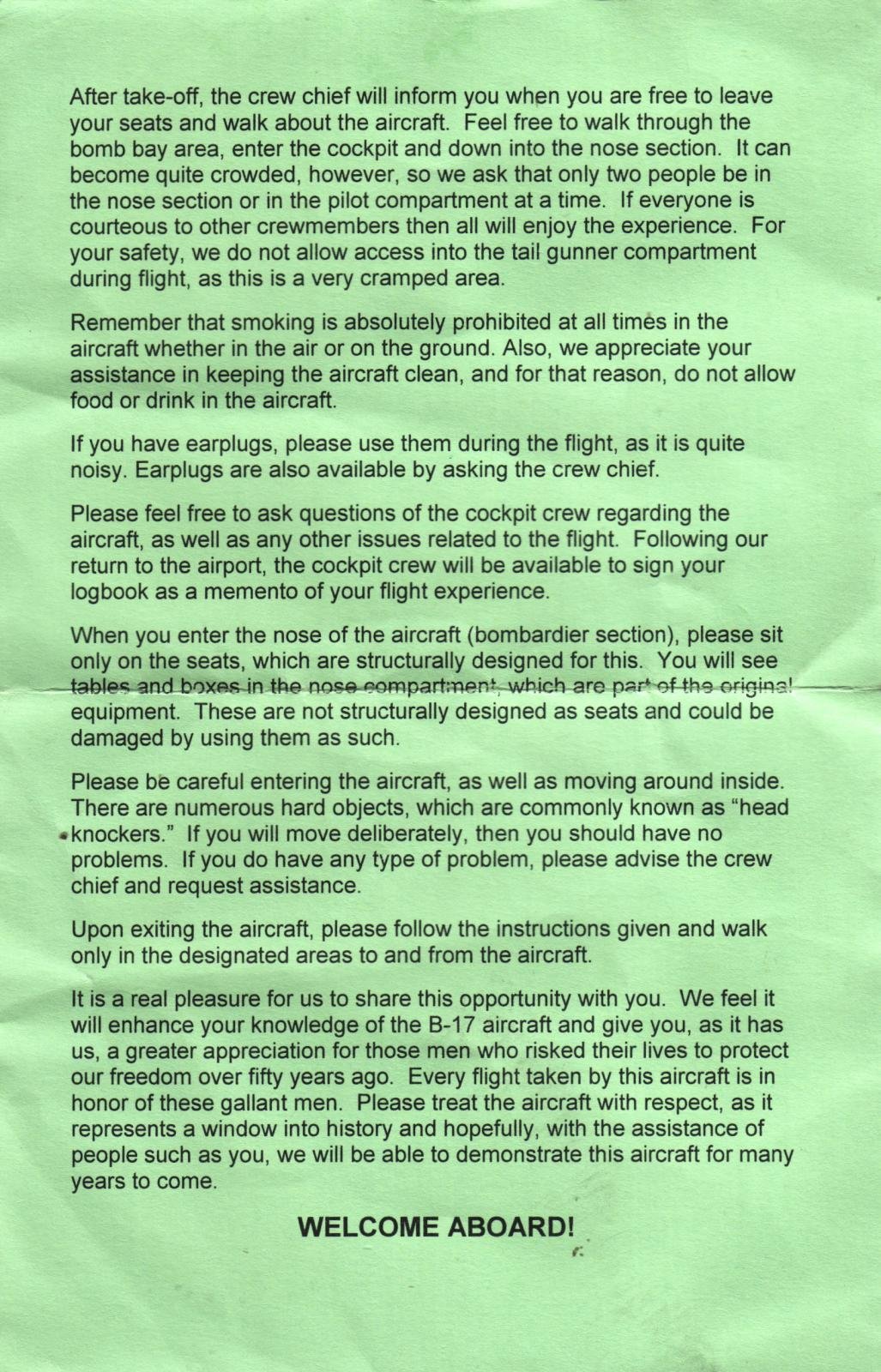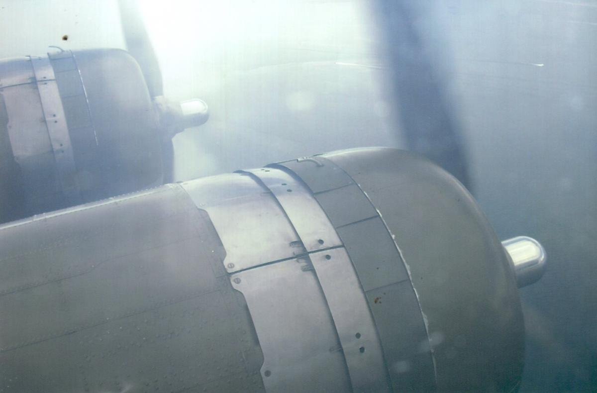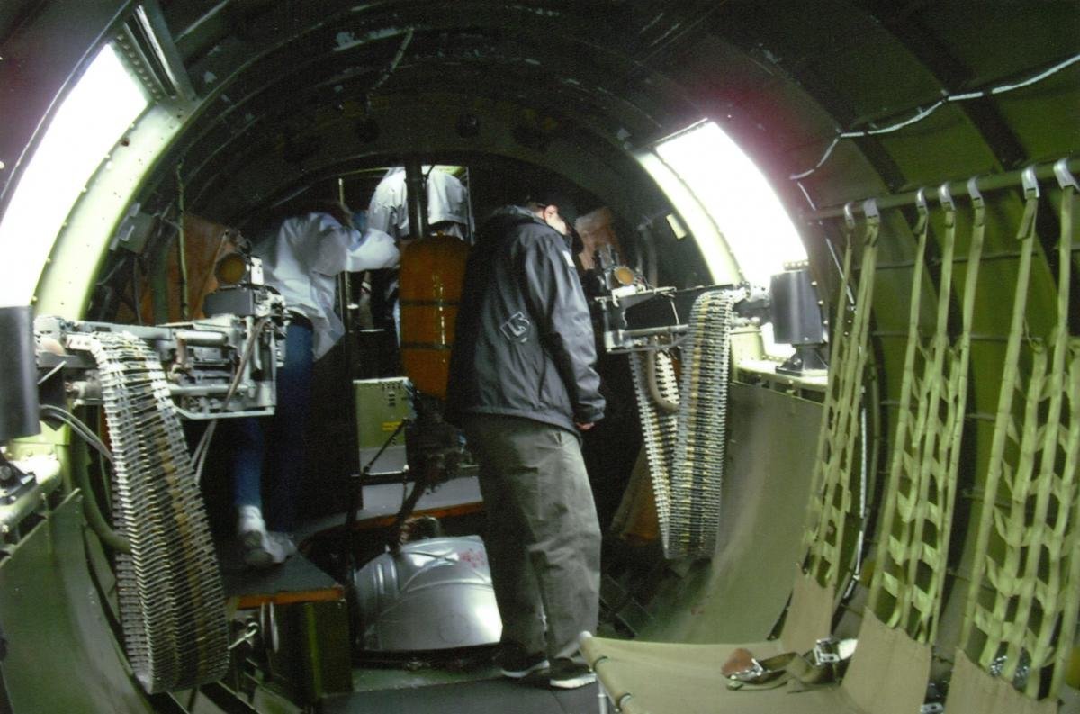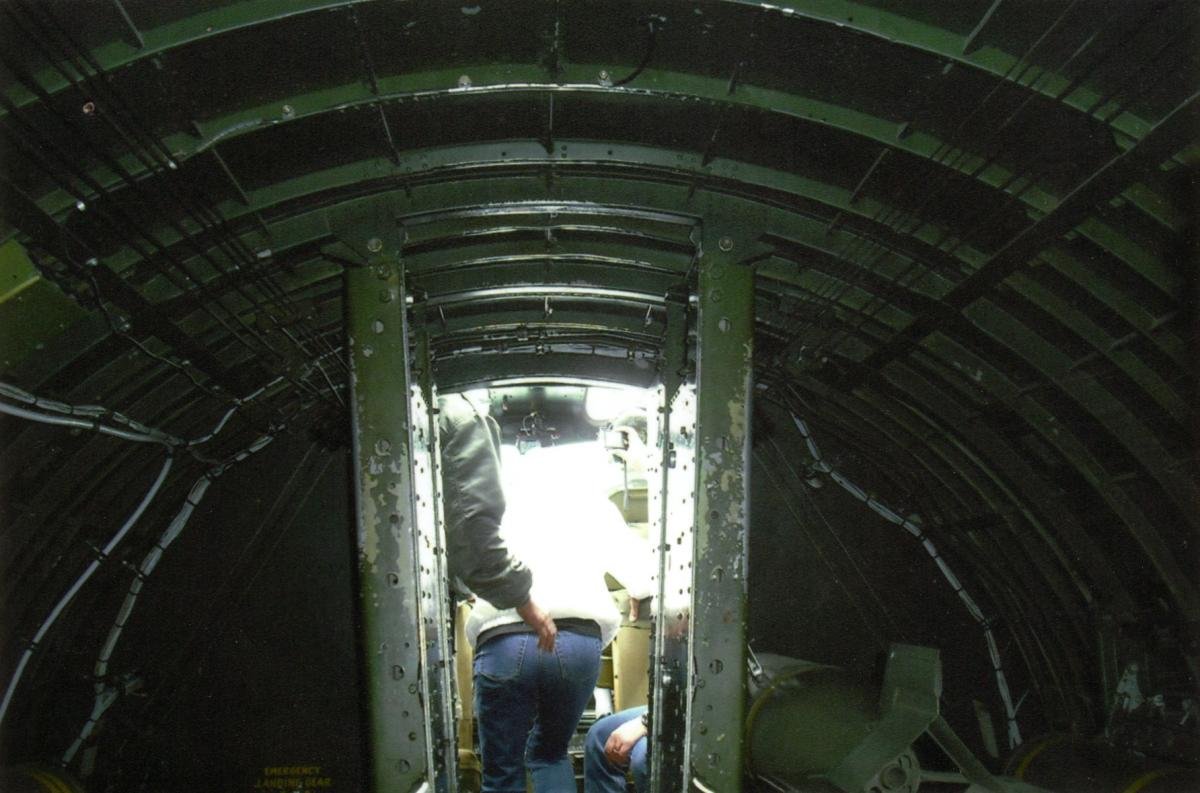 One thing you notice immediately when you are sitting in a B-17 is how thin the aluminum skin on the fuselage is. Flak or MG bullets passed through it like a hot knife through butter. The Vets explained to me the reason for this was to allow them to carry the maximum bomb load, which was normally twelve 500 lb. anti-personell bombs or sometimes the WWII version of a "Bunker