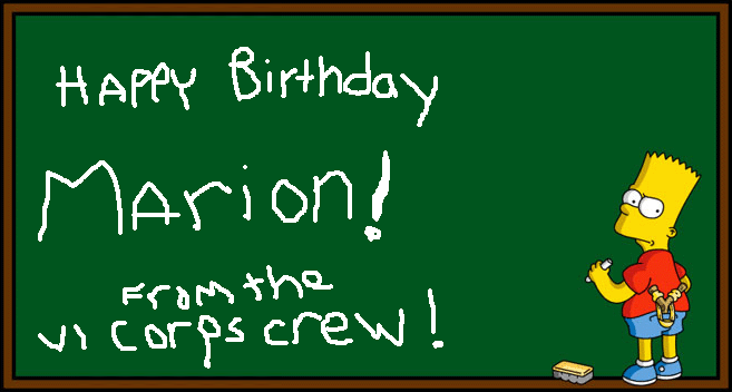 Hey Todd, I still have the photo of you holding up the happy birthday Marion sign, from Iraq, which you sent last year. It's still hanging on my laser printer!
