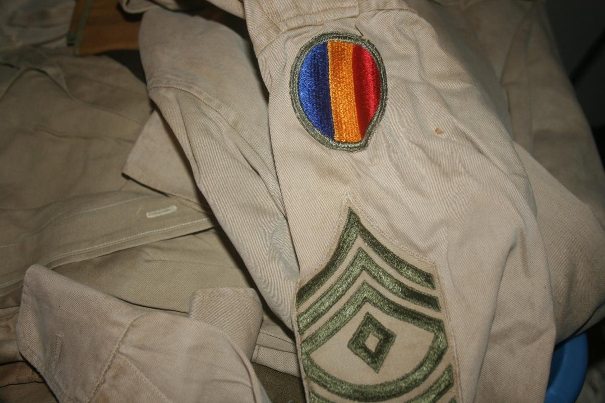 The soldier's name was G.W. Powell (it was written on the collar of some of the shirts). According to his Army number he was a draftee, he said that draftees numbers began with the number "3". The patches indicated he was a first sgt. The colored patch signifies a state-side division.