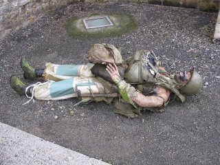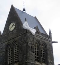Stained glass window in the chapel of Sainte-Mère-Église depicting the Virgin Mary and two paratroopers, one of which is John Steele.Monument to John Steele who was caught on the church spire during D-Day