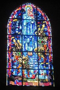 Stained glass window in the chapel of Sainte-Mère-Église depicting the Virgin Mary and two paratroopers, one of which is John Steele.