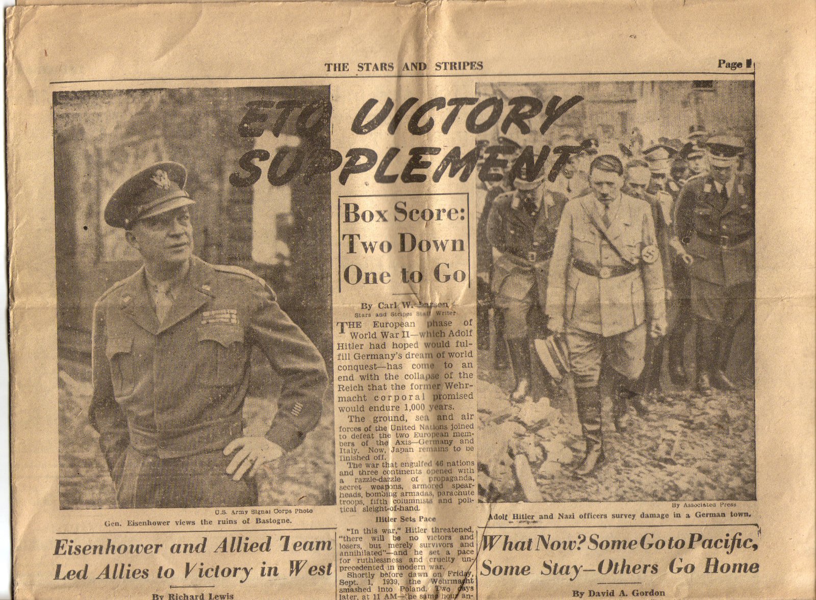 Unbelievably, peace was finally coming to Europe. The world listened with joy at 3:00 p.m. on May 8, 1945, as British Prime Minister Winston Churchill confirmed that the German high command had met with Allied officials the previous morning and signed surrender papers. Churchill's familiar, grandfatherly voice crackled out across radio airwaves, "The German war therefore is at an end."