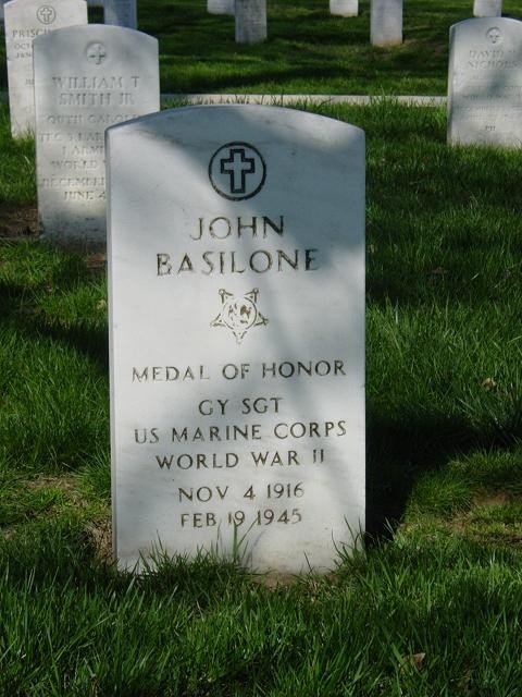 He held off 3,000 Japanese troops at Guadalcanal, after his 15-member unit was reduced to two men.[2] Basilone was killed in action on the first day of the Battle of Iwo Jima, after which he was posthumously honored with the Navy Cross. He is the only enlisted Marine in World War II to have received the Medal of Honor, the Navy Cross, and a Purple Heart. Basilone is buried in Arlington National Cemetery.