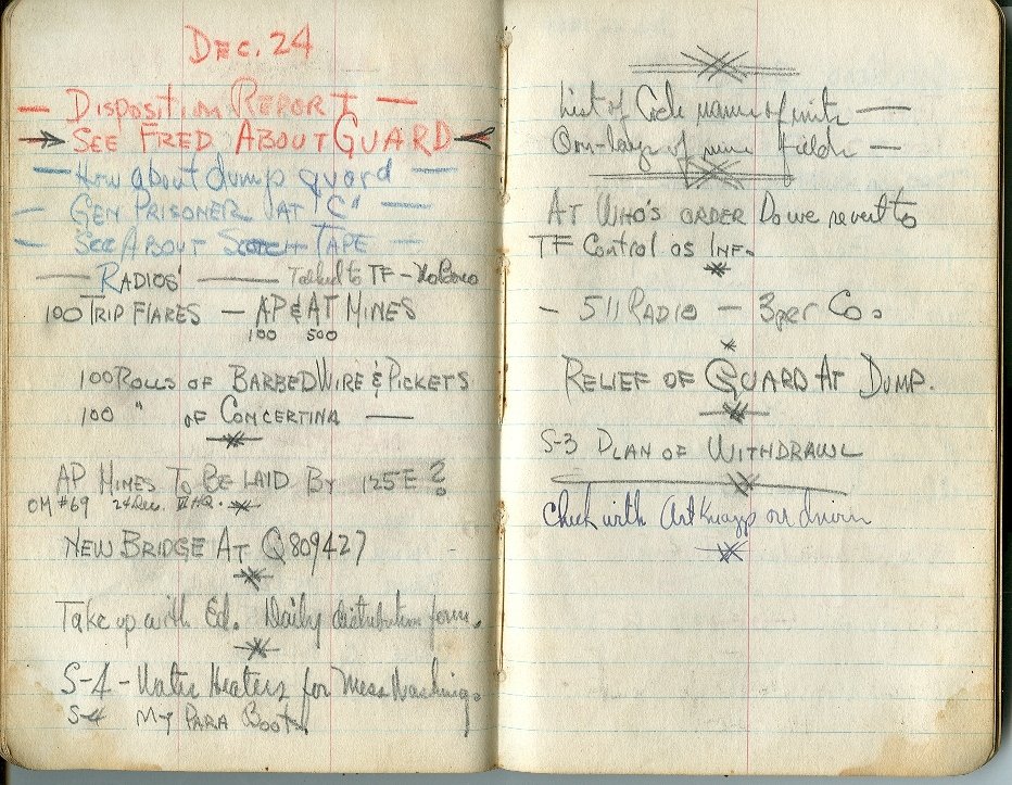 Here are some more scans from my grandfather’s notebook. I interesting how much one can learn form just notes taken for that day’s activities. Also, you can tell something from what is not there as well. Notice what is written for Christmas Eve of 1944. "Ask Fred about guard", "See about scotch tape", "AP mines to be laid at 125E?" Nothing much said about the holiday.