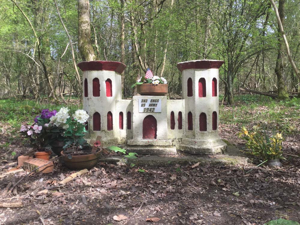 Marion – Just wanted to let you and all the 343rd know that, at long last, after having written about it in “Home Bases” I finally got to return to make a return visit the 343 ‘Castle’ memorial at Nettlebed yesterday with my family. We planted a small American flag there (as you can see from the picture). It was lovely to get back and see it – I don’t think I had seen in for 20 years! Certainly I couldn’t tell where it had been struck by the Mini about five years ago. I shot the picture of it as I found it…only having planted the little American flag in the bowl on the roof. Afterwards I removed a couple of the sticks you can see in the foreground.