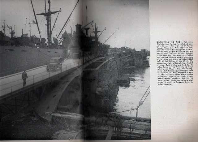 "Outwitting The Nazis. Retreating Nazis intended to clog the Allied advance with this and other ships sunk in Naples harbor.When U.S. Army Engineers eyed this hulk, however, they recognized an asset. Quickly they guaged its position near the blasted docks, tested its stability. Satisfied it was stuck fast, they threw up a bridge and enabled full-scale docking operations to be carried out on the barnacle-studded hull. All five hatches of the Liberty ship shown moored alongside are being unloaded at once. Guns, clothes food flow to Allied forces clawing their way up Italy`s spiny terrain. Much of the Corps of Engineers` efforts to keep supply lines open lifted few eyebrows save those of experts in logistics. Here the ability of the Army`s builders to improvise, points up their deeds in spectacular fashion."