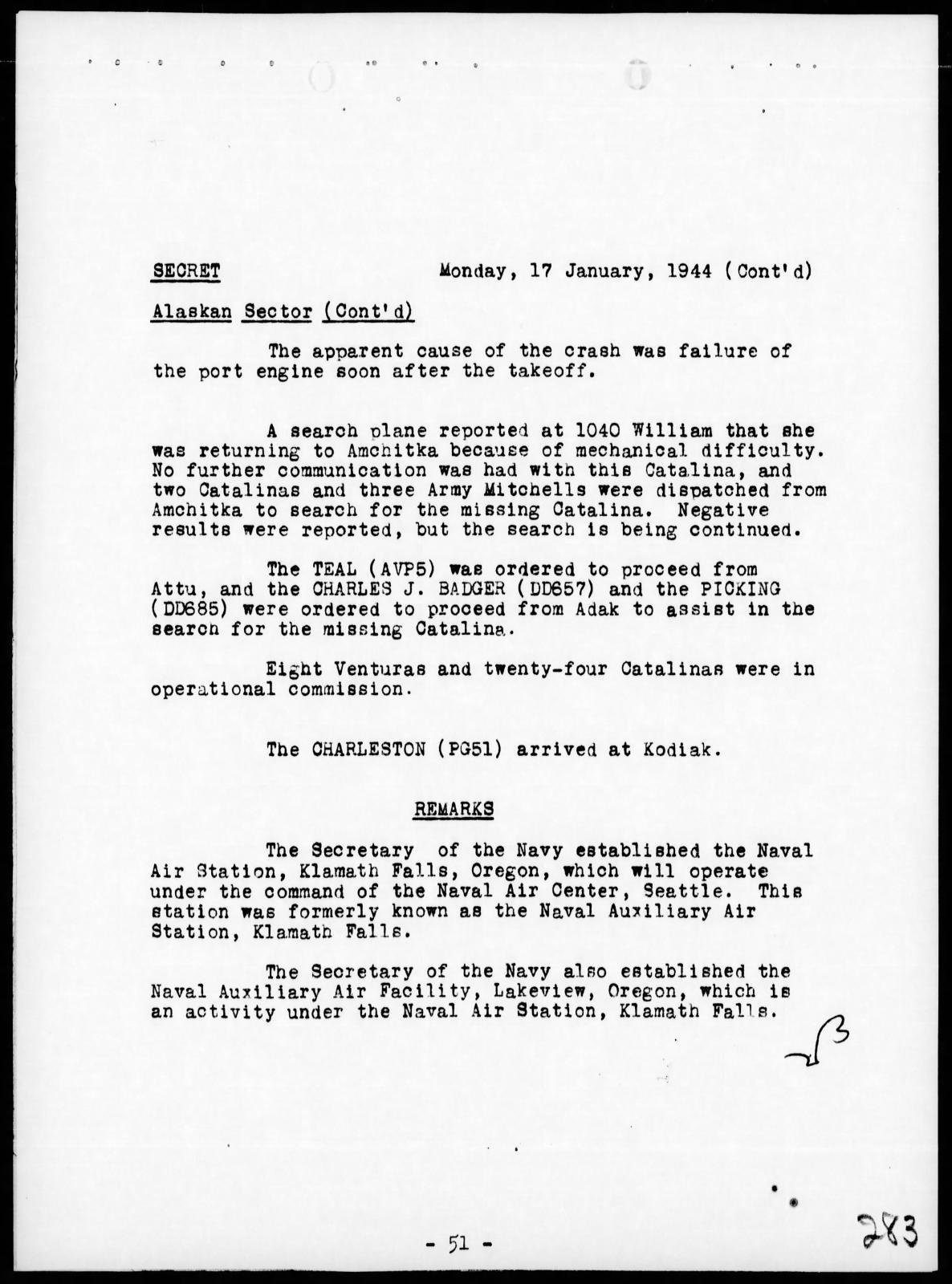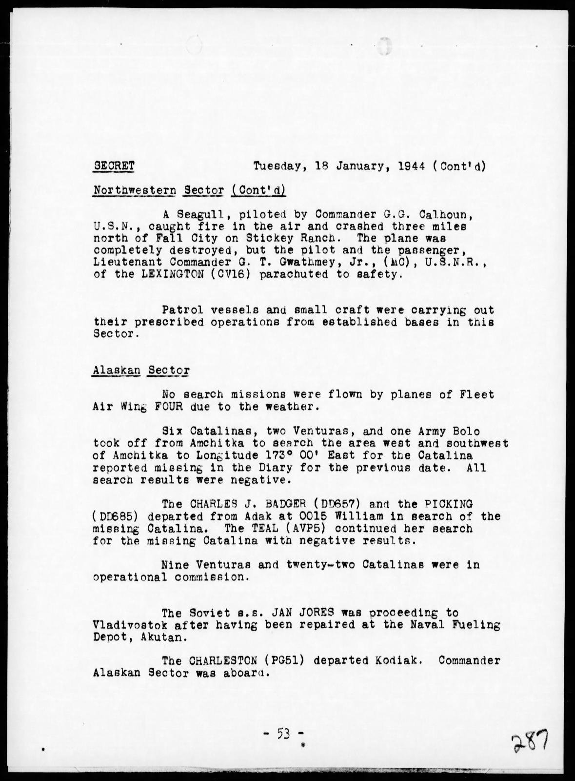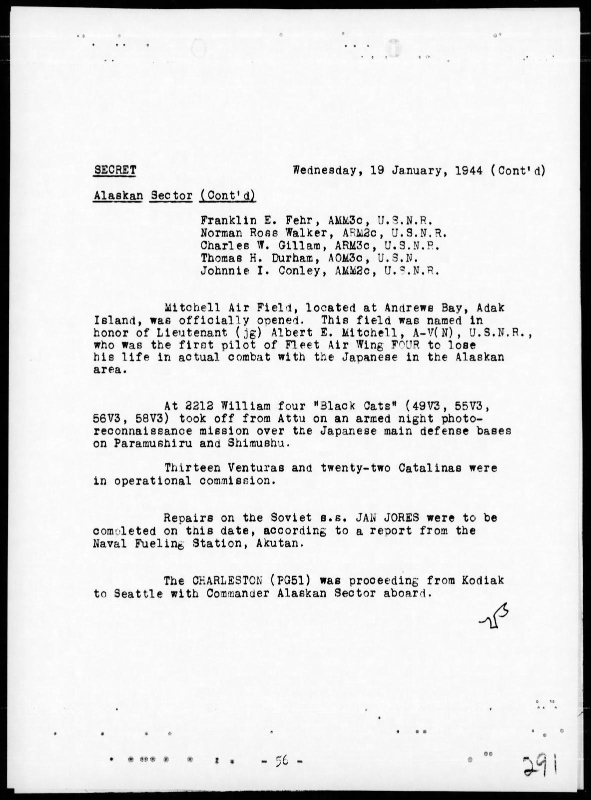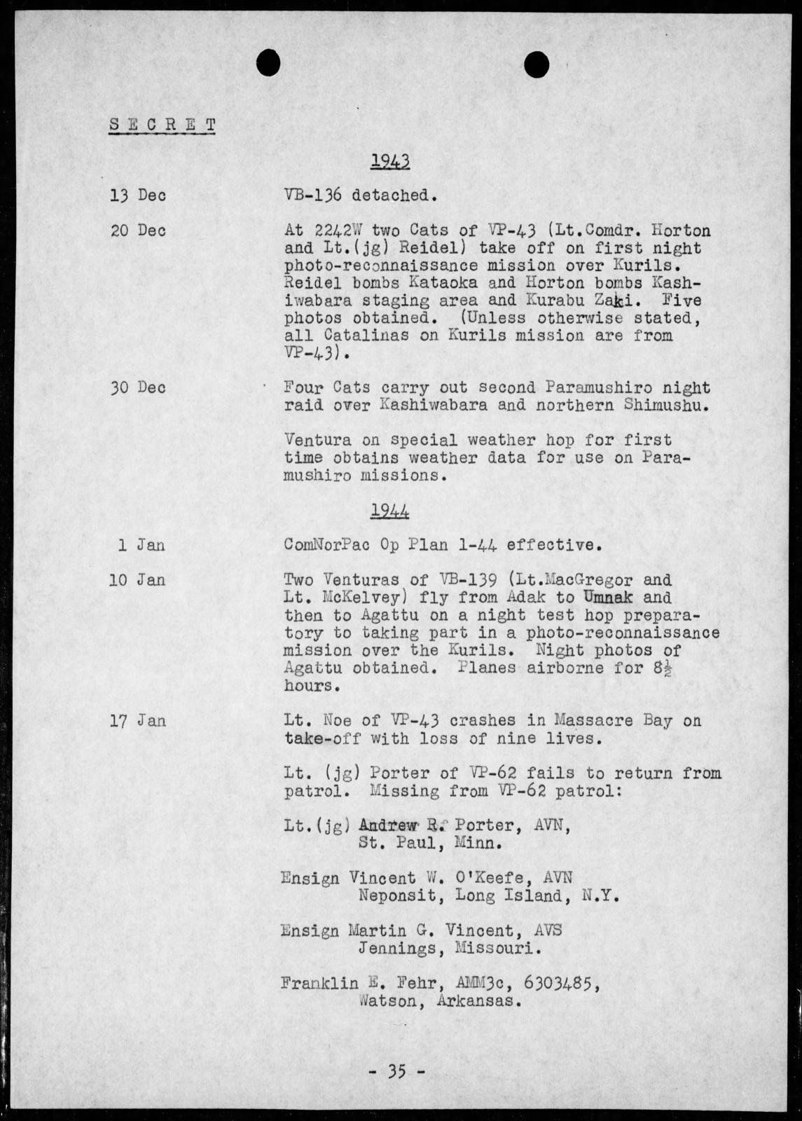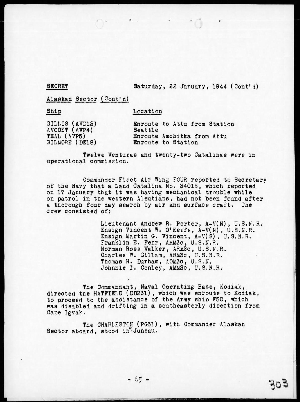 From the war diary of Fleet Air Wing Four, based in the Aleutians, Thomas was a crew member on Catilina, No 34018, that reported on 17 January 1944 that it was having mechanical trouble while on patrol in the western Aleutians. The plane had not been found after a thorough four day search by air and surface craft.