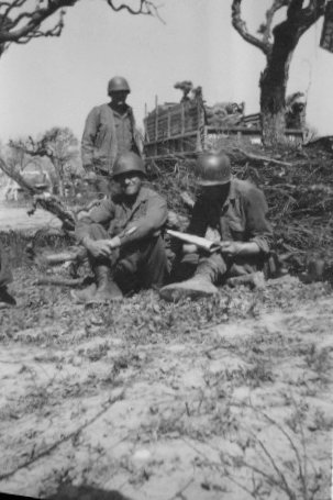 The unit was back on the line in the Highway #65 sector the first week in December. Time was spent checking the cratering charges placed earlier, and maintaining the roads, as well as improving living condidtions as much as possible. Three caves in rock cliff in the Sabbioni area were turned into "barracks" complete with double bunks. Doors were made of scrap wood and materials salvaged from shelled buildings. Other men built "bungalows" from scrap wood, sandbags and shelter halves. But most outstanding was a 60-foot by 30-foot mess hall, which was made from several thousand sand-filled 105 mm howitser shell cases. At night, the mess hall was used as a t heater for the enigneer troops.