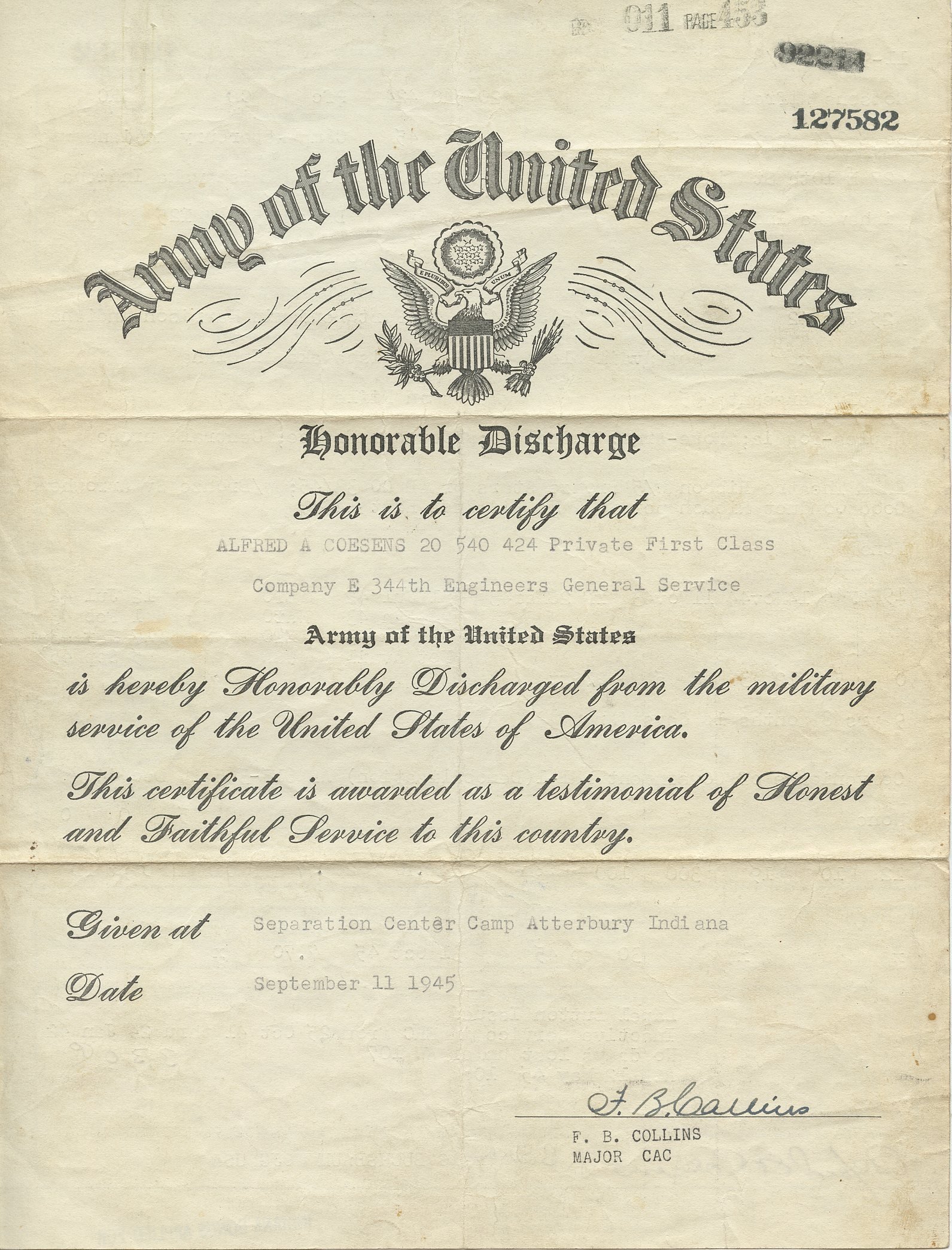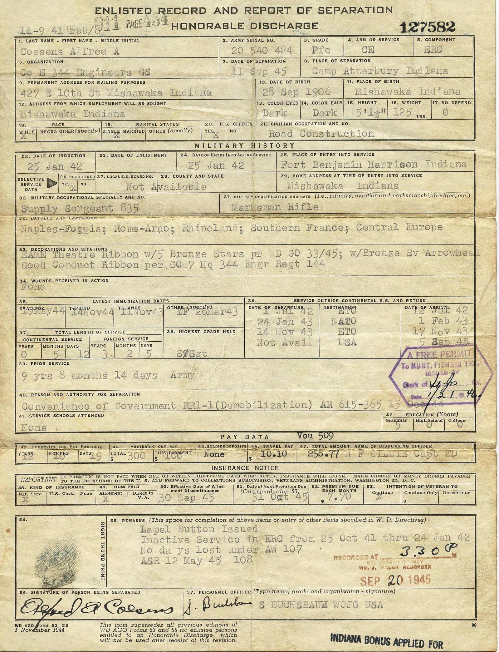 I am new to this site and forum. My Great Uncle, Jerome J. Massoth served in the 344th E Company. He had told my parents in his last years about being under sniper fire while building bridges, that is how he became a Staff Sergeant. He got a battlefield promotion after his Staff Sergeant was killed on a bridge by a sniper. As he had told it many of the men in his company were killed that way. He suffered from battlefield fatigue from watching everyone get killed and they couldn't fight back, they just kept sending out more men to keep building bridges. As he explained it, one day he went to his superiors and said he wasn't going out there anymore. He was shipped back to the states around March-April 1945 to be processed out with an honorable discharge. What I found interesting was he was originally with the 113th Engineers 38TH Infantry Division "Cyclones" of the Indiana State Guard. They were sent to Ft Shelby for training but he didn't stay with that unit which went to the Pacific. He was moved to 344th with the VI Corps while at Ft Shelby and stayed with them until early 1945. I am starting to build a shadow box to honor him-he passed a few years ago. My mother was going through his belongings and found the Book "the 344th goes Traveling along with a map showing everywhere they went, how long they stayed at each location, how long they spent on a ship between each location and that on thanksgiving day one year at sea they only ate K Rations the whole day. She also found his own personal Photos of the battlefields and bridges, his original ribbons and his 344th Unit Pin. Also have his 38th Infantry division Annual from Ft Shelby before he joined the VI Corps. A lot of information to go thru when I can get up to Indiana.
