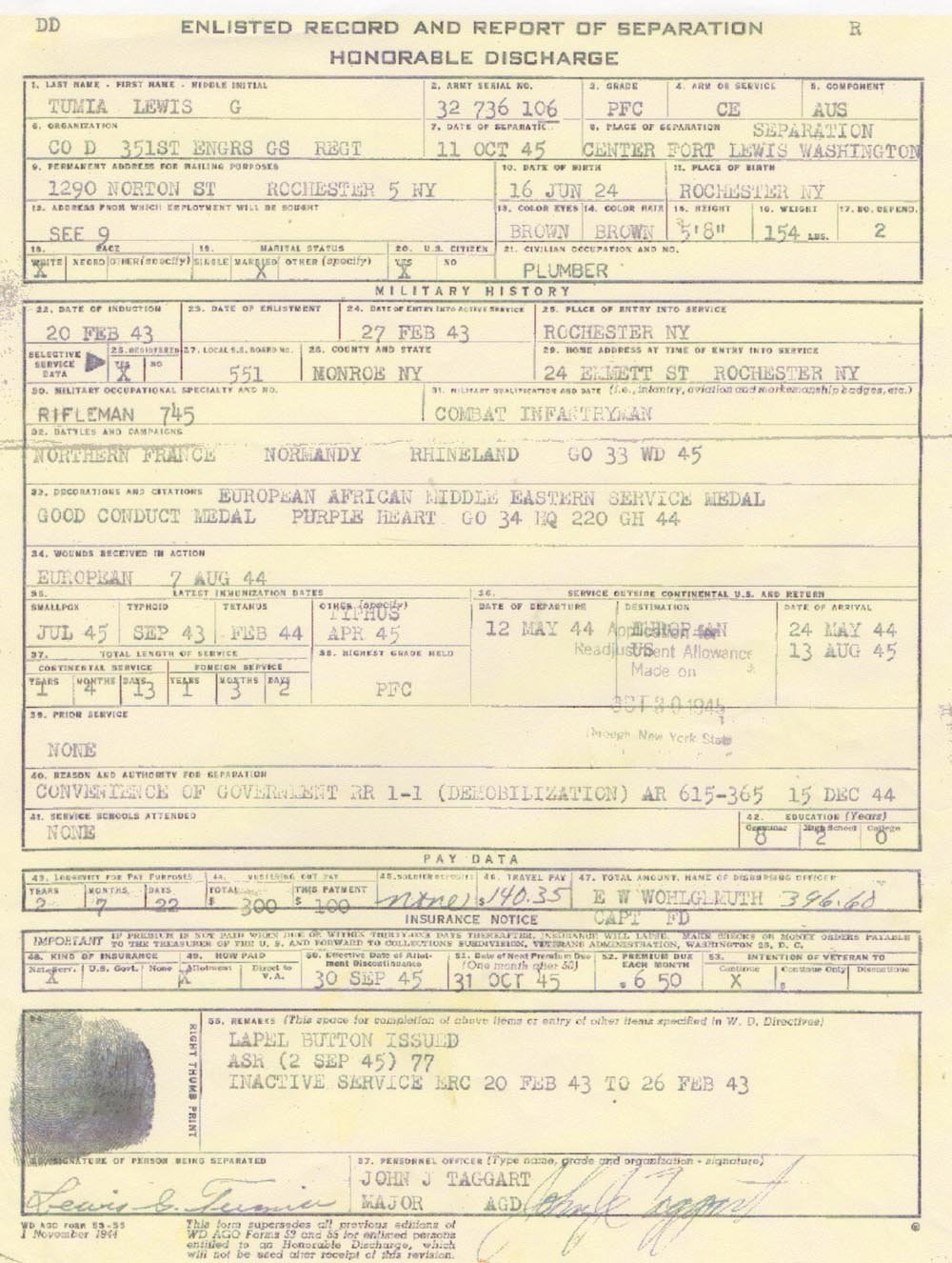 Would love to know some information about the 351stEngr. GSR. My grandfather, Pvt Lewis Tumia was in Co D. I have read the PDF file for this regiment and am having a discrepancy with the dates so I am wondering if I have something incorrect.