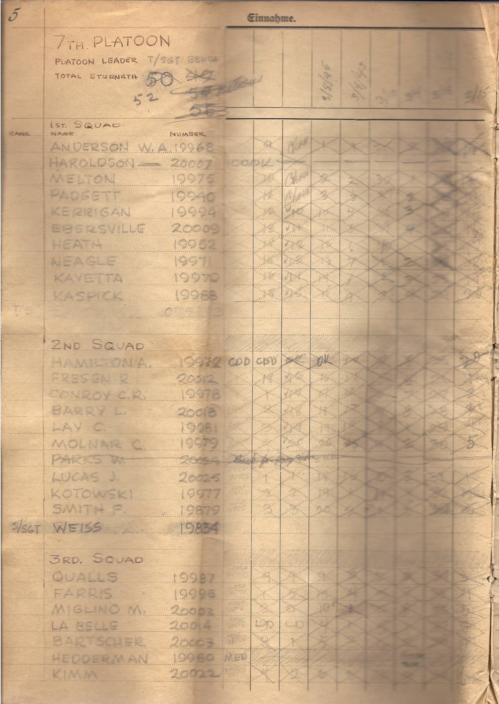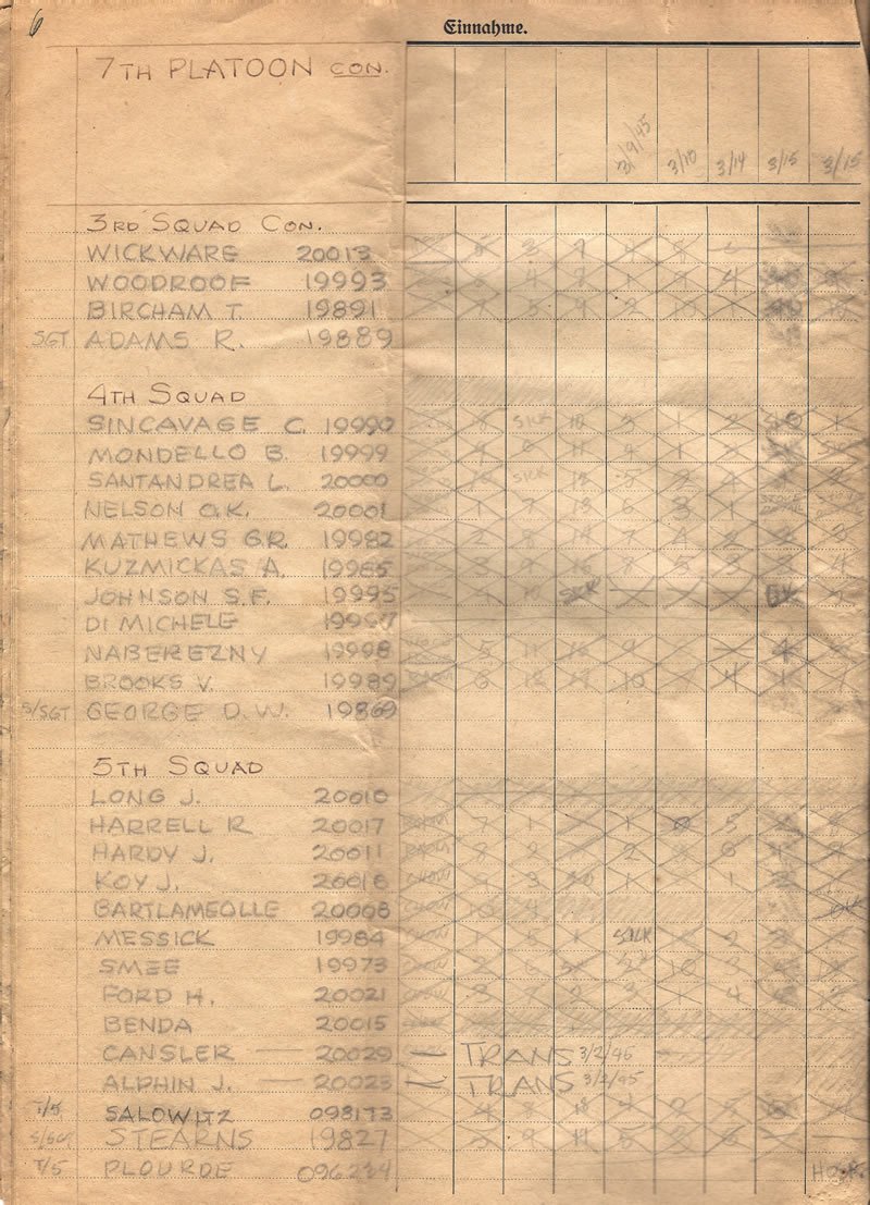 When I sent you pages from my dad’s Duty Roster from Stalag XIII-C, I didn’t realize the 157th was with 6th Corp. As I looked up names on the Duty Roster, I found an article about Charles Sincavage from the 157th. In the article, he mentioned his buddy Kuzmickas. Both of these men were in Platoon 7, 4th Squad.